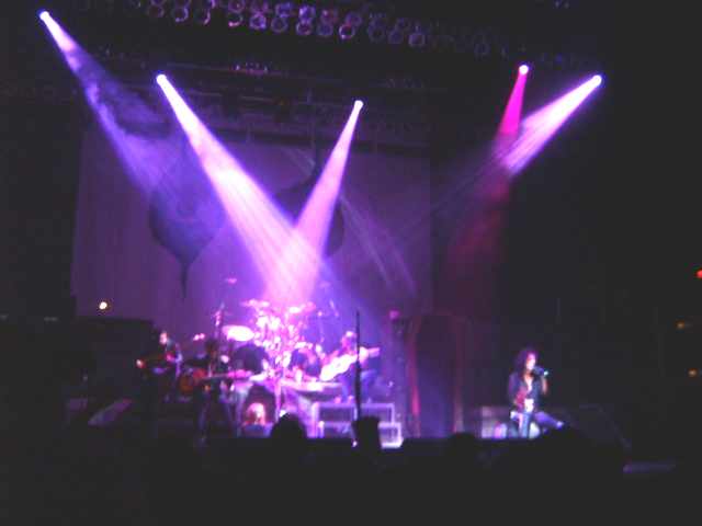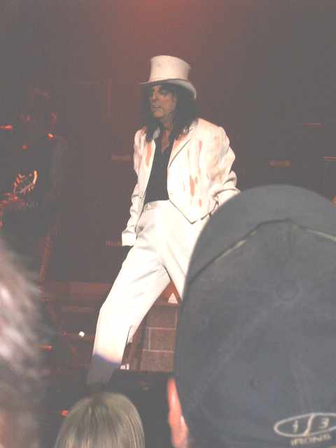 t-shirt Hello There, Big Eyes, If You Want My Love, Southern Girls, Best Friend, I Want You to Want Me, I Know What I want, Voices, Never Had a Lot to Lose, The Flame, 70's Song, Surrender // Dream Police, California Man, Goodnight Now Victoria had been lucky enough to have got front row seats from Trick International's pre-sale, so we were right in front of Rick with a fantastic view of the stage. For Cheap Trick's opener, the multi logo was projected onto the stage backdrop, and for "Big Eyes" that changed to rotating black and white checkerboard. After "Big Eyes" Rick announced "Just in case you're not sure we are in Colorado, and we are the one, the only, accept no substitutes Cheap Trick" which brought a cheer from the crowd. After "Southern Girls" Rick noted that the crowd was "a noisy bunch tonight I like that!" He also spotted someone on Tom's side about 10 rows back holding up a Fuse LP cover. He remarked that it was so old that "Thomas Edison played on that". I think Tom recognised the person as Megan. Rick also spotted Stacey from Denver's sign that this was her 123rd show, and then mentioned that the new CD should be out next year. He then introduced the next song as having 3 chords, E minor, C and A "so play along". The band then went into "Best Friend", as usual with its long, intense and frenzied second half. Wonderful stuff, and Rick broke a string towards the end, I'm not surprised. "I Want You to Want Me" was the usual crowd pleaser, and the checkerboard design was back on the backdrop. After that, Rick chatted with the crowd "Did I mention that we're called Cheap Trick?" He added that he'd wandered around outside today, "Great looking bikes, also great looking women I have a Harley but I don't have a woman. But I do have a sidecar!" He went on "Actually, I have a Harley on order I've been waiting since the "In Color" album, when I got screwed!" He finished up by noting that "Alice is here, and is backstage doing something weird I wish we had a camera so you could see or maybe you shouldn't!" He then introduced Tom who sang "I Know What I Want". After that song, he acknowledged "Harley riding Tom Petersson right there", before introducing "That living legend on the drums, Mr Bun E Carlos". Victoria and I tried to get the "Bun E" chant going, but no one joined in! Rick also introduced Robin, and also spotted AC/DC singer Brian Johnson's wife in the front row. Although enthusiastic, this was one of those shows where the crowd just didn't know the "cool voices, warm voices" part during "Voices", so Rick had zero success getting anything more than some ragged cheering when he tried to get some singing from the crowd! Rick was slightly late back on stage at the start of "Lot to Lose", and mouthed "I f*cked up!" At the end of the song he passed his guitar to a fan in the front, to the mild concern of his tech Jim. He then asked the crowd "Is this Loveland or Fort Collins? I'm confused. No, wait a minute its Budweiser, Colorado!" in recognition of the venue. Thinking about it, that was a little odd since we were surely in Coors country? Anyway, Rick pointed out a child in the front row, as well as saying hello to a man sidestage "who'd just got back from Iraq yesterday", which brought a warm response from the crowd. That "70's Song" saw the multi logo and a swirling colour psychedelic background on the backdrop. The band had played a nice, energetic show, and it was no surprise that Rick twice got a big response to his encore question "Does that mean you want to hear some more?" During "Dream Police" Rick almost kicked his mic stand over, though it came to rest leaning against his steps. Towards the end he lay sideways on his steps to sing into it, and messed with one of the techs who ran on late song to try to right it. "California Man" saw the checkerboard pattern on the backdrop, and the band finished their well received set at 8.41pm. Well, we'd got a good performance from the band, with another 90 minutes to come from Alice Cooper. Cheap Tricks kit and backline was quickly removed and the stage set up for Alice, with the drumkit on a raised rear stage level. There was also an intriguing empty coffin standing up in front of the raised level on what would be Tom's side of the stage, and at the back of Rick's side could be seen an angel of death high up on something. Hmmm, interesting stuff. I am ashamed to admit that I've never seen Alice before, though I've liked most of his singles. I know he puts on a very theatrical, so-called "shock rock" show, and I'd heard enough from the early shows on this tour to look forward very much to what I was about to see. Warning: For any fans due to see Alice's show later in the year in the UK or elsewhere, you might wish to skip the next few paragraphs as they'll be a spoiler for you! The lights went down at 9.15pm, and some taped organ intro music from "Phantom of the Opera" was played, pierced by a loud woman's scream. And then the lights went up, and Alice's young looking but very competent band started up, with Alice soon appearing from a cloud of dry ice beside the drumkit. I didn't take notes like I do during Cheap Trick's set, so I can't/won't go into as much detail as I would for CT. But for Alice afficienados, his set list was as follows: Phantom of the Opera (intro tape), Department of Youth