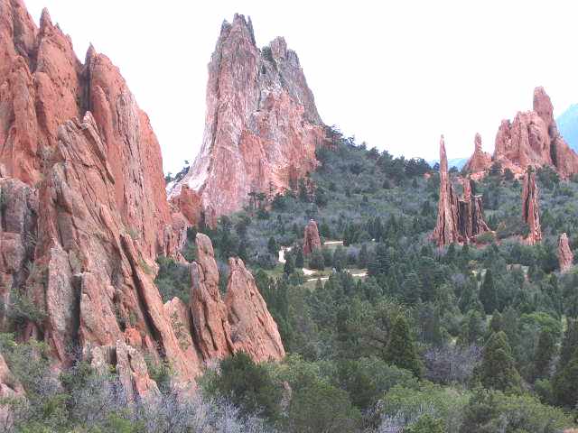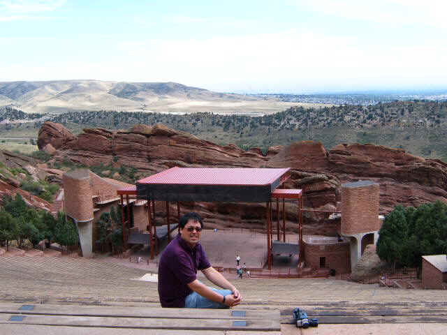 Hills, Under My Wheels From the start it was clear that Alice's set was music theatre. Just like Rick and to a lesser extent Robin, Alice had his stage moves and expressions to match a lyric. He also made a point of whipping up the crowd by occasionally throwing things into the crowd - his black cane (during, I think "No More Mr Nice Guy"), strings of silver beads during "Dirty Diamonds", green AC banknotes off his sabre during "Billion Dollar Babies" and another cane during "Schools Out". The show was very impressive (at least in my opinion, though perhaps I'm easily amused ) and Alice was literally moving all the time. His daughter came on stage 3-4 times during different songs to help act out a particular song, and for one ("Welcome to My Nightmare"), Alice had his large albino python on his shoulders. I really dislike snakes, but I will admit that this was a beautiful reptile, obviously used to being part of a loud show, and Alice handled it expertly whilst singing. The centrepiece of the show was preceded by a 4-5 minute drum solo by ex-KISS drummer Eric Singer. Alice and the band returned, and played a number of songs that loosely told a story of insanity and murder, culminating in two night creatures coming on and seizing Alice, and laying him in the guillotine where he was to pay for his crimes (the guillotine having been wheeled on, and it was that which featured the angel of death high atop). The audience was whipped up by Alice's daughter, the night creatures and his band, and I have to say I was a little surprised to see a few young children at this and subsequent shows witnessing this mock beheading. Or maybe I'm just an old fart. Anyway, Alice duly had his head "removed" and his daughter (in character) paraded it on stage before putting it into the coffin, atop a number of other body parts that Alice had earlier assembled there. Soon after the music stopped, bright lights highlighted the coffin which was cloaked in dry ice and Alice strode out (complete with head!) wearing a blood stained white suit to the familiar opening chords of "Schools Out" for the set closer. The encore included "Poison" and "Under My Wheels", and then it was over. Phew! Talk about a performance of music theatre! I really enjoyed Alice's set, and we'd really had our money's worth in getting to see a full set of tight musicianship from Cheap Trick plus the theatre of Alice Cooper. Over past years I've enjoyed seeing Cheap Trick with a number of other bands, but this truly was a terrific double bill. I've later read some people saying that Alice left them cold and they'd left a show early, and everyone's opinion is valid. Speaking for myself, this was a great joint show. The show ended at 10.45pm and as ever it took awhile to get out of the parking lot. We followed somewhat suspect direction signs back to the Interstate, but we eventually got on and headed south back to Denver. One show down and three more to look forward to! Mon 5 Sep - Cheap Trick at Pueblo, Colorado Like last night I had another somewhat broken night of sleep, waking up for awhile around 4am. Hmmm, maybe its the altitude? Anyway, another bright and sunny day, and we were soon heading south down to Colorado Springs. Once there, we went and drove around the bizarre yet striking "Garden of the Gods", featuring fantastic red slabs of sandstone standing high and dwarfing vehicles and people. And this too was in the shadow of nearby Pikes Peak, which had inspired the writer of "America the Beautiful". We later checked into our hotel and headed on south in the hot afternoon sun to Pueblo. It was an odd place, downtown (well, what we passed by on the northern side) was empty and somewhat shabby, and the State Fairgrounds were a further 4-5 miles away. We managed to pay and park near a Gate and went in to find that the venue for the show was right on the other side of the Fairgrounds. <sigh>. The place was packed, and was typical of any large American fair. A long line was already in place at the entrance to the rodeo arena, and in the hot late-afternoon sun, they were getting agitated as the minutes ticked by the 6pm entrance time. Finally at 6.15pm people were allowed in. In total contrast to last nights indoor arena, this was outside, with a large stage set up on one side of the rodeo arena and facing the grandstand on the opposite side. Many people opted to take their seats in the shade of the grandstand, though a lot walked or ran onto the dusty rodeo ring and stood in front of the stage. I should mention that the stage was pretty high, at least a dozen feet off the ground, so the crowd barrier to the front was quite a way from stage front otherwise those at the front just wouldn't be able to see anything! As it was it was still a neck-craner. There was also a big screen off to Tom's side of the stage. By the time Victoria and I got in, the front was pretty packed, but we managed to get a spot way off beyond Rick's side. We were on the barrier, so had a clear but somewhat restricted view, and I wouldn't see Bun and would barely see Tom. Waiting for the show was hot business, and not helped by the numerous flies buzzing around the rodeo ring and nearby livestock pens. We had 3 relaxed security guards near us as they waited to take their positions when the show began, and there was a funny moment about 15 minutes before Cheap Trick came on. We could clearly hear one of the guards walkie-talkie's, and his colleague at the entrance gate buzzed through to share a piece of news with his colleagues - "I just stopped a guy coming in he had a 15 foot snake that he wants to give to Alice Cooper"! Absolutely true! I felt like leaning over to tell the guard that Alice has already got one Cheap Trick came on at 7pm with the stage still bathed in early evening sunshine. There was by now a sizeable crowd in the rodeo ring in front of the stage, as well as a lot of people in the 1500-200 seat grandstand opposite. RN - Black suit, black Piece t-shirt He