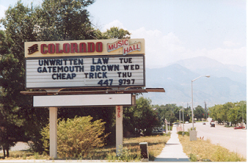 Ogden Theatre, Denver Earlybirds in line at Denver! Billboard at Co Springs (Pikes Peak in b/ground!) Colorado Music Hall, Co Springs Girl Brand guitar In line at Colorado Springs! You'll find my review of this trip and shows in the "Reviews" section. |