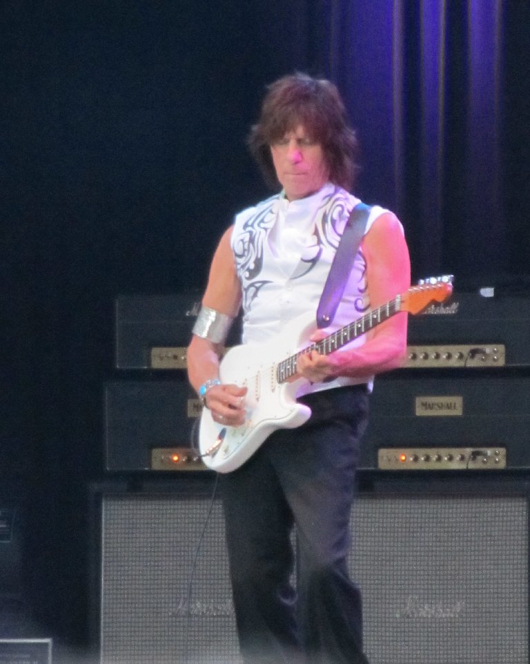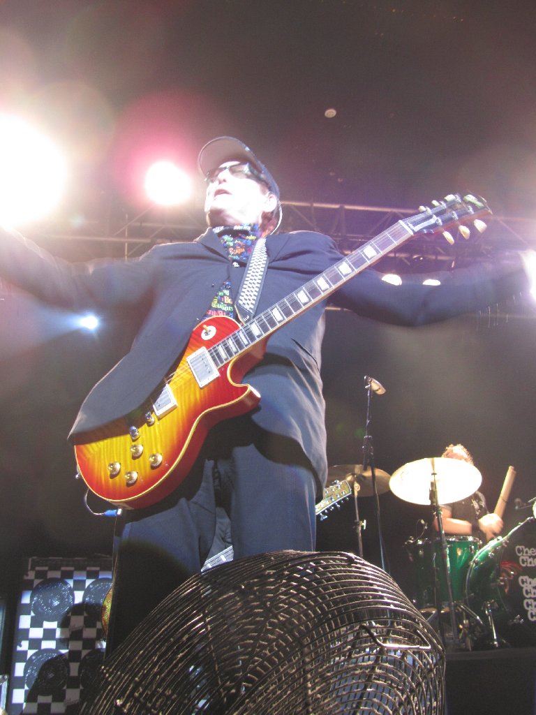 & white Beatles shirt, DP bow tie Hello There, Big Eyes, California Man, Ain’t That a Shame, Baby Loves to Rock, Magical Mystery Tour, IWYTWM, Flame, Need Your Love, Sick Man of Europe, Surrender, Auf Wiedersehen, Goodnight Now. The band performed well despite the frequent spells of heavy rain, blown towards the stage by a gusting wind. The crowd was warm but not overwhelming towards CT, perhaps because of the rain, and perhaps because Cheap Trick were something of a contrast to the headliner. The style of this set was similar to the set at the Download Festival, where every minute was important and so Rick really cut down on his stage banter. The setlist is pretty self explanatory. After “Baby Loves to Rock”, Rick said “Thank you Hamburg. If you’re not sure, we are Cheap Trick”, and after “IWYTWM”, he thanked the crowd for having Cheap Trick in Hamburg, and briefly introduced the band. He finished by saying “It’s an honour to be on the same stage as Jeff Beck, he’s number one”. That was no throwaway comment, it’s been long documented how much Cheap Trick (and Rick in particular) are fans of Jeff Beck. Robin sounded hoarse during “The Flame” and didn’t try for the long note. After “Surrender” there was a short band meeting on stage”, after which Rick said “We’ve got time for one more, thank you”. That one became two, as they played “Auf Wiedersehen” and then closed with “Goodnight Now” with 3 endings. Before leaving the stage, Rick said “Thank you very much, we’re Cheap Trick, we’ll see you around”. The show ended at 7.38pm, and the crowd had visibly swelled during the bands set. Hopefully some new fans were made. During the show Rick did try to bridge the grassy gap between stage and crowd, venturing down 3-4 times to throw picks, and even posed briefly mid-set with a security guard off in front of the left side of the stage. Jeff Beck came on at around 8.15pm or so, and it was cool to see all of Cheap Trick plus many of their crew watch the master at work. He played technically brilliant guitar, making even the most difficult seem effortless. Somewhat odd though was having planes pass by every few minutes as they approached the nearby airport. However, not a single drop of rain fell during the guitar god’s set. The 5 of us left Hamburg at 10pm, getting back to Osnabruck around 1am for yet another obligatory rock & roll late night!