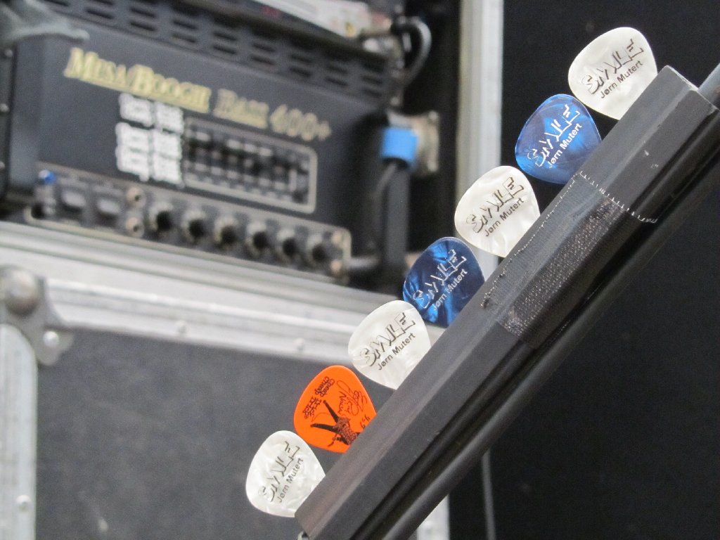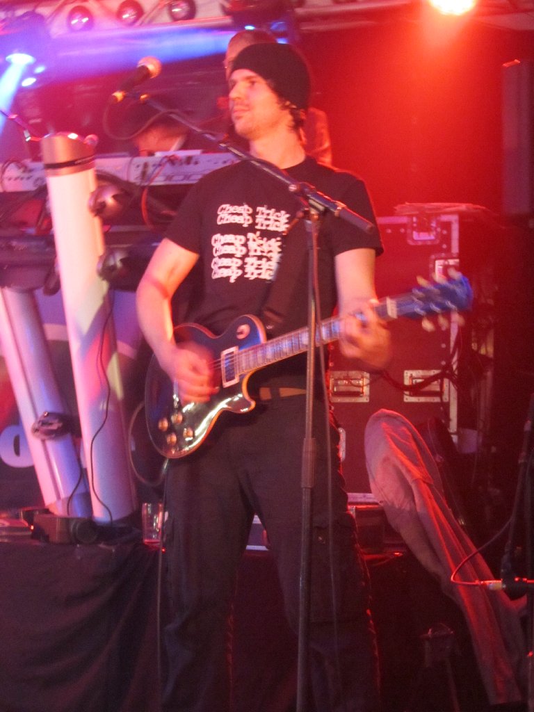 ever consider that hotel again. Bed about midnight. Sun 12 June - Leicester to Bristol, Cheap Trick in Bristol, UK Second show day today, and as predicted, the rain wasn’t far away. We left the hotel at 8.30am, and stopped maybe 20 minutes later at a motorway service station that offered free Wifi (Hilton, take note). By now it was persistently raining and chilly, so I was thankful the outdoor Download performance had been yesterday. I used the free Wifi to send some pix from the show to CT’s official website. We then drove on down through the rain to beyond Bristol to visit some of my family and have a country pub lunch. Got into Bristol at 3.30pm, parking in the multi-storey car park next to the O2 Academy venue. The inside of the venue was intimate, with a nice sized stage, and a fairly shallow main floor with a raised bar to the rear. There were stairways with distinctive railing panels to each side of the main floor, going up to a balcony, though this was to be closed for tonight’s show. The band soundchecked from 5.20pm, playing a bluesy instrumental, before “House is Rockin” (no vox). Rick invite the young singer of the support band Plead the Fifth (actress Jane Seymour’s son) up on stage to vocal “Closer” and he did a good job of that. The PT5 entourage (including Jane) were delighted. Later, “Girlfriends” was played by CT. I didn’t get to see Plead the Fifth play as I was busy doing other things, so I’m afraid I can’t review them. The familiar audio montage started at 8.58pm and Cheap Trick took to the stage at 9pm. RN – black suit, multi
