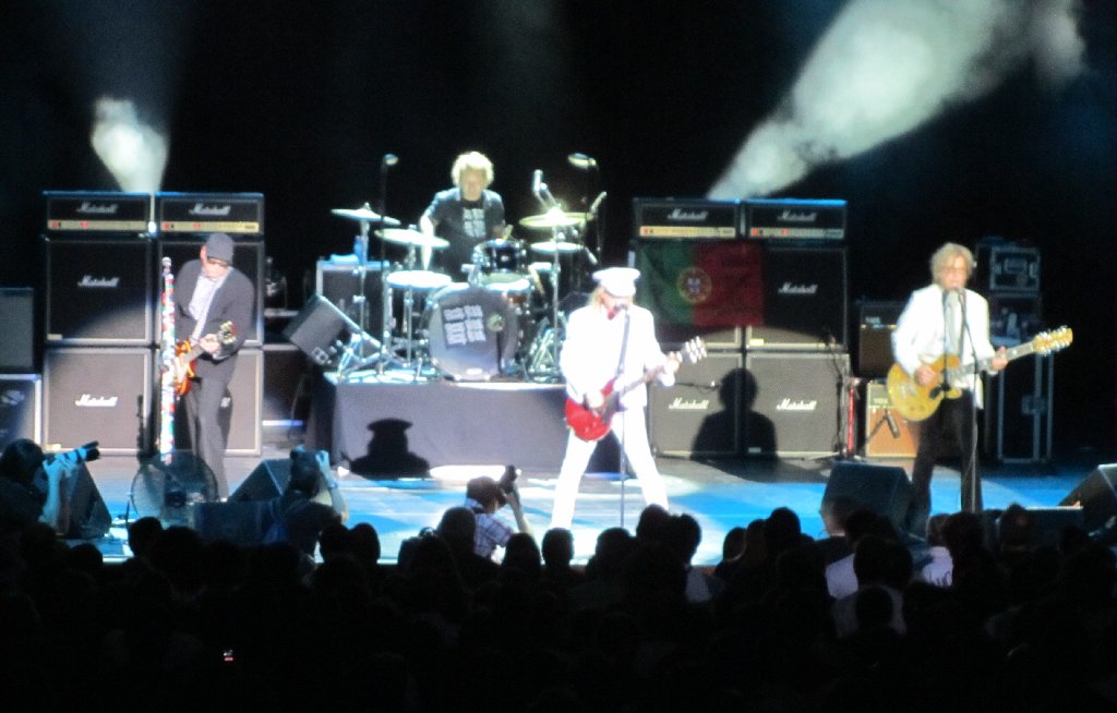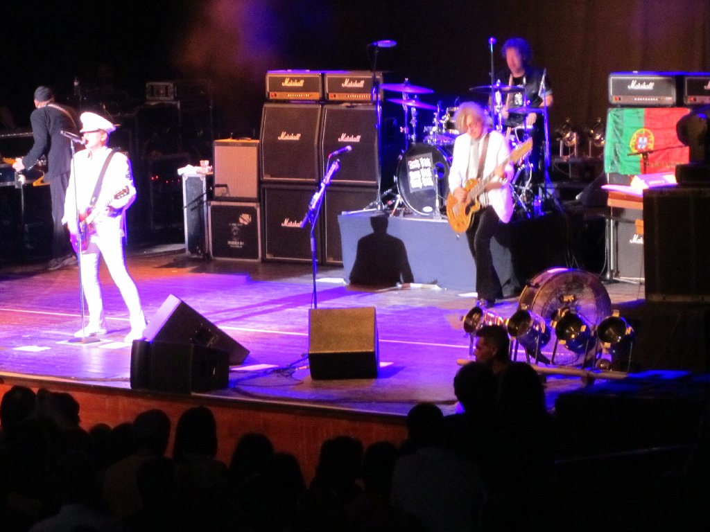 when I’m dead. Wed 22 June – Travel to Portugal, Cheap Trick in Lisbon I had 2 hours in bed, but not two hours of sleep. Perhaps an hour at most. Up at 1.15am and out of the house at 2am. It was dry and mild and dark as I drove south, though I did run into spells of light drizzle. I parked near Heathrow at 5.30am and was at the airport and checked in around 45 minutes later. My TAP (Portuguese Airlines) flight was uneventful, and I did like their imaginative pre-take off animated safety video. Yes, it’s sad to be something of a connoisseur of such things! The plane landed at sunny Lisbon at 10:45am, and here I was on my first visit to Portugal, with not a single word of Portuguese vocabulary to my name. I’d have to rely on the limited translations in the two guide books I’d hurriedly bought in Leeds yesterday evening. Oh, one odd thing I spotted (caution: boring airport observation coming up). Lisbon had a big terminal with a lot of gates. In fact, it has two terminals. However, my plane from London parked a long way away on the tarmac and we got bussed to the terminal. And there were maybe 15 other planes in sight, from British Airways, Air France, and Portuguese airlines, and all were parked on tarmac. Not a single plane was at a terminal gate. Trust me, as a frequent flyer, that’s pretty rare and weird to see. Annoying too as a passenger not to just walk off the plane and into the terminal. Anyway, immigration was quick, and thankfully my small suitcase made it onto the carousel too. It was easy to get the pretty cheap Aero Bus towards downtown, and the airport is only 4-5 miles from the centre of Lisbon. I got off at Saldanha, and in high 20’s C sunshine I walked about ¾ mile to my hotel. It was noon and I was earlier than the regular check-in time, but the nice young woman on reception took pity on me and checked me in. Not only that but she gave me a top/7th floor room with a small balcony. Thank you, and I recommend the Turim Alameda hotel! It was great to get to the room and change into fresh clothes. I was back out at about 12:35pm and found my way to the nearby metro station, just 5 stops/10 minutes from the old town. I bought a bargain 24 hour ticket for under 4 Euro, about US$6, which allowed unlimited rides in that period. I did some walking in the pretty but crowded downtown, but didn’t find the item I was looking for. Oh well. Back at the hotel 3 hours later I showered and changed for the evenings show, my 6th out of the 7 European dates so far. The entrance to the Coliseu Lisboa was situated in a fairly narrow pedestrian street slightly north of the old town. It had a couple of nice, large Cheap Trick show posters on display. Inside was the impressive circular venue, something like a smaller, darker and slightly faded Royal Albert Hall. The stage was both wide and deep with a high ornate surround. Seating had been removed from the main floor so that was all standing on a dark brown carpet, surrounded by a low, wrought iron railing. All around were 7 rows of steeply banked wooden seating, then two levels of private boxes, and then a top level of standing room. Directly opposite the stage, to the rear of the venue was an ornate box for the most special of guests (like a royal box), and the ceiling was domed. Despite the bright sunshine outside, it was quite gloomy inside, both in décor and light. It did look better later when more lighting was on. Soundcheck started soon after 5.00pm, the whole band beginning with a bluesy instrumental before playing “Stiff Competition” and “Oh Caroline”. The backline was different than at earlier shows because of the difficult logistics/timescale of trucking from Dresden to Lisbon, with the main backline stopping to Vitoria, Spain. Rick also had considerably less guitars. A local band played from 9-9.25pm, though I saw little of them. A few local fans met with the band shortly before the show, one giving Robin a small Portuguese flag with the wording “Cheap Trick – We want you in Portugal”, which was hung on Tom’s amps before the show started. The familiar audio montage began at 9.58pm, with Cheap Trick hitting the stage at 10pm. RN – black suit, black