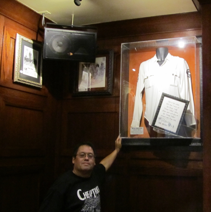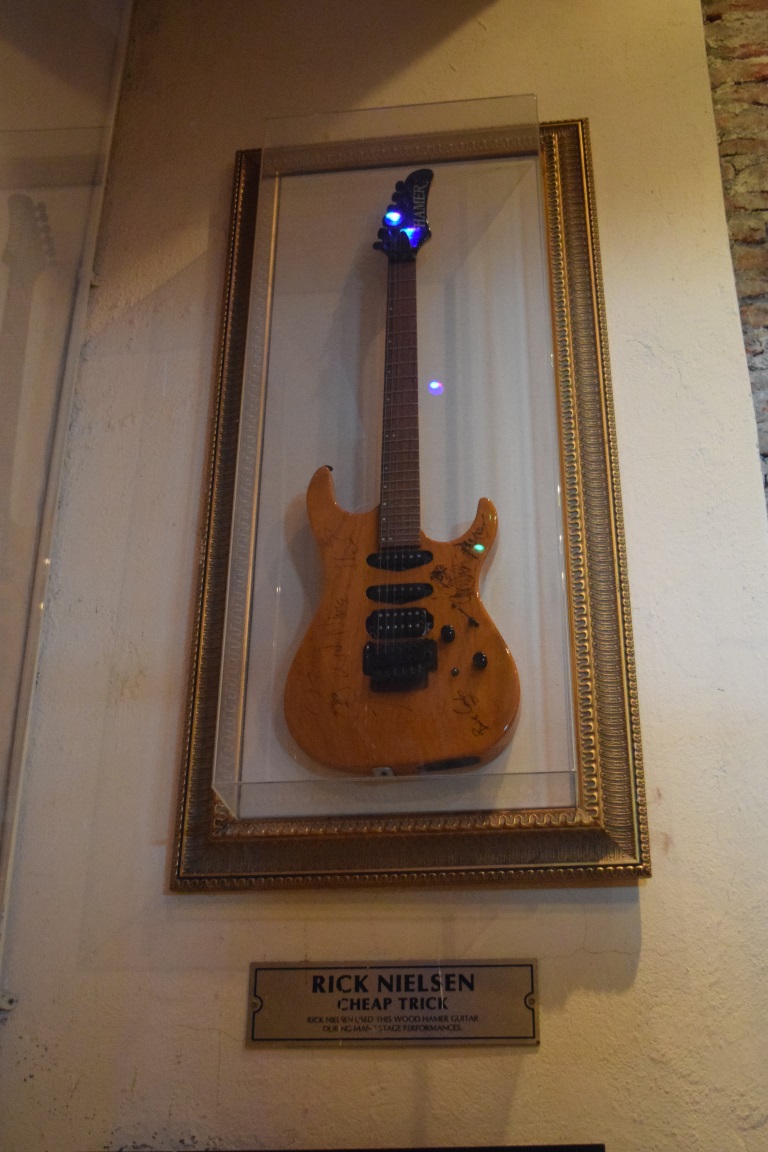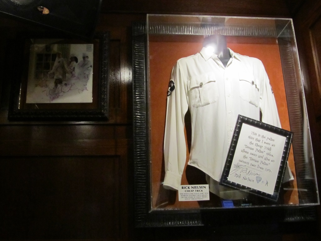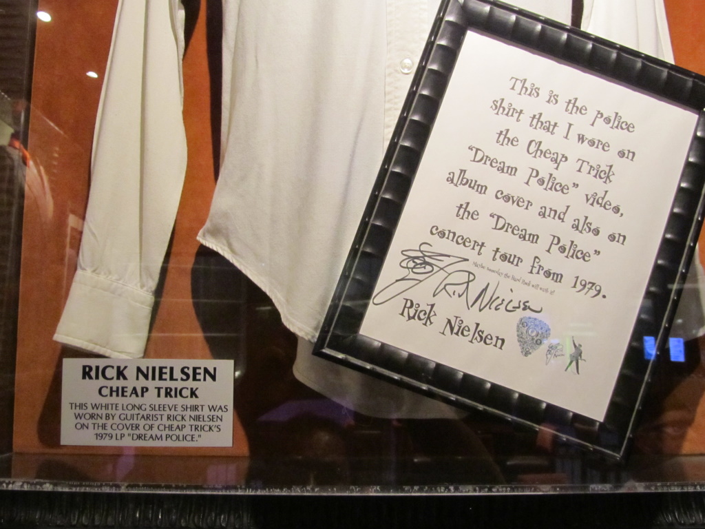 The motherlode of Cheap Trick items can be found on the left hand wall just inside the entrance to the Hard Rock Cafe (which is within the giant Hotel/casino). First of all there is one of Rick's skeleton sweaters, a picture of him performing in it in San Juan in 1994 and an explanatory plaque. Then there is a gold "Dream Police"