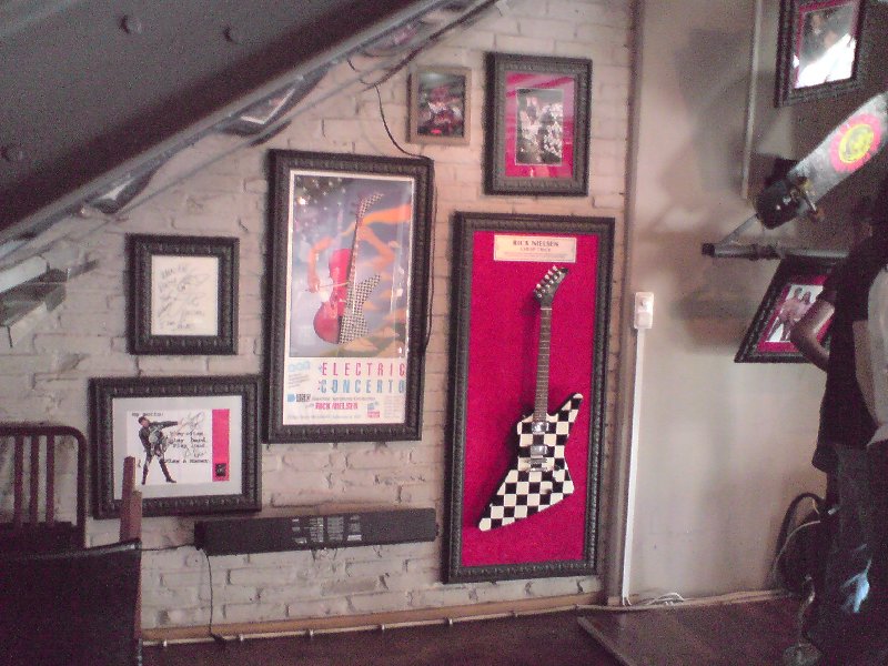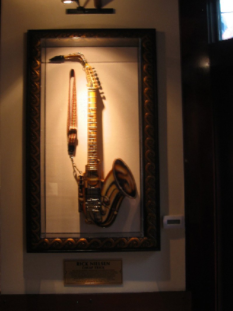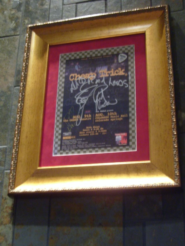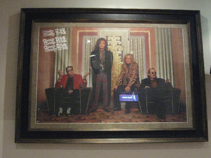 recalled from a few years back. Thanks Mike! Orlando, FL I don't have a photo, but I understand there's a picture of Robin in the lobby of the Hard Rock Hotel in Orlando. But thanks to Sayuri for the shots above, from (I believe) "The Kitchen" at that Hard Rock Hotel, of clothing worn by Robin and Rick when appearing as celebrity chef's there, also a couple of framed photo's on display. But, the nearby Cafe (at Universal Citywalk) seems to be a treasure trove of CT items - signed "In Color" LP, "Busted" poster, guitar, show handbill and signed "Sex.America.Cheap Trick" box set. Thanks to Adam B for these pictures. There's also a large picture of Rick