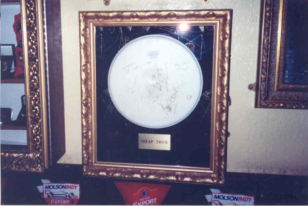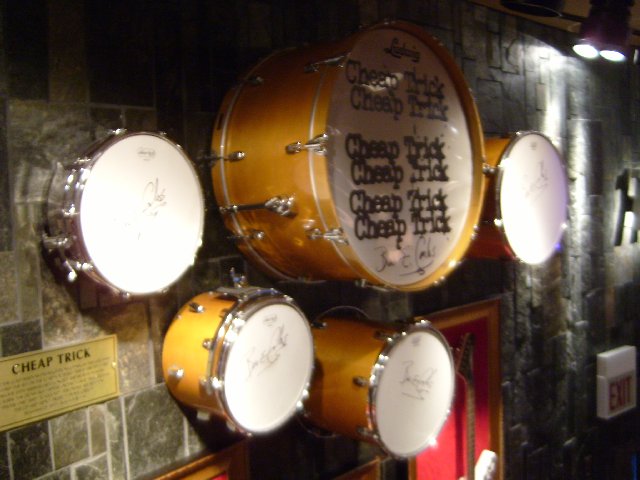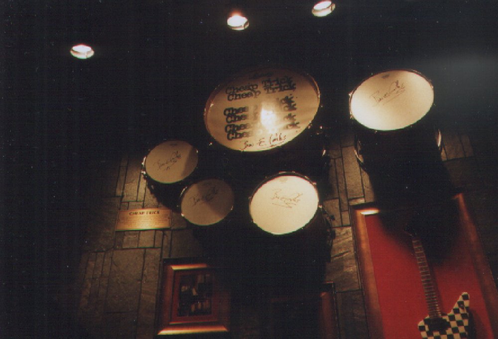 Seoul, South Korea I visited here in April 2008, unfortunately a week before the remodelled Cafe re-opened. However, because of travelling for Cheap Trick's Australian tour in Nov 2008, I got to revisit Seoul and this time the very smart and spacious basement Cafe was open. And in one corner, there's quite a find of CT items. There's an unsigned "One on One" LP cover, an unsigned "Busted" era poster, a nice early 90's era picture of Rick and Robin, a signed "Don't Be Cruel" 7" sleeve, and a Les Paul guitar signed by Rick, though the signature is very, very faint. Beijing, China I visited here in March 2011, and was very pleased to see this full drumset of Bun E's prominently displayed. Each drumhead is signed, though its hard to see the bottom one due to a light right below it. As the accompanying plaque says, this set was used on the road and in the studio, and can be seen in the "Cold Turkey" video. *new addition* Fiji Thanks to English fan Ian Edmundson for sharing this picture of a Rick-signed guitar that his wife took at the Fiji HRC in October 2010. Guam The new (as at Oct 2008) HRC Memorabilia website says that this Cafe displays a painted upright bass that Tom used in the "Woke Up With a Monster" video. Go to this link to view the bass - http://memorabilia.hardrock.com/?item=035107 Shanghai and Taipai Thanks to a couple of Cheap Trick fans