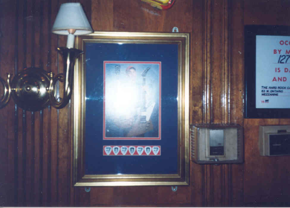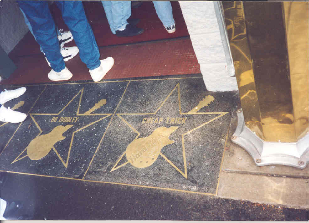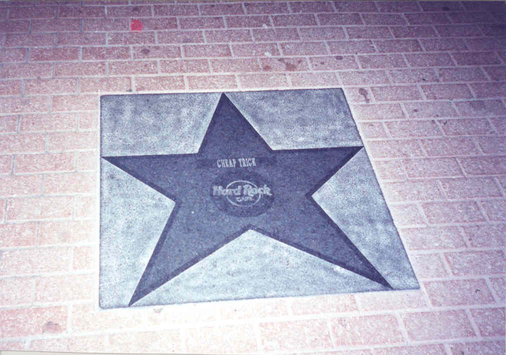mine. Niagara Falls, Canada A group of fans ate here after the first Niagara Falls show in June 2005! It takes a bit of searching, but you can find FOUR Cheap Trick items in/around the Canadian HRC. Within the Cafe, there is a green Hamer guitar (plus pick), a "Lap of Luxury" platinum award, and one of Ricks old (late 70's) picks within a display of "101 picks of the Stars". Outside, you can find a CT star on the sidewalk, but it is probably 50 yards along the street from the entrance to the Cafe. It's actually difficult to photograph and my shots were all lousy, but thanks to Zandergal for letting me use her picture! Oh, and there was no CT stuff in the HRC on the American side in June 2005. Thanks again to