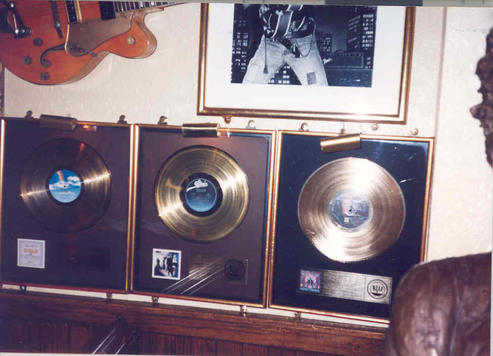platinum award to Epic Records for "At Budokan". Above that is a Gibson bass