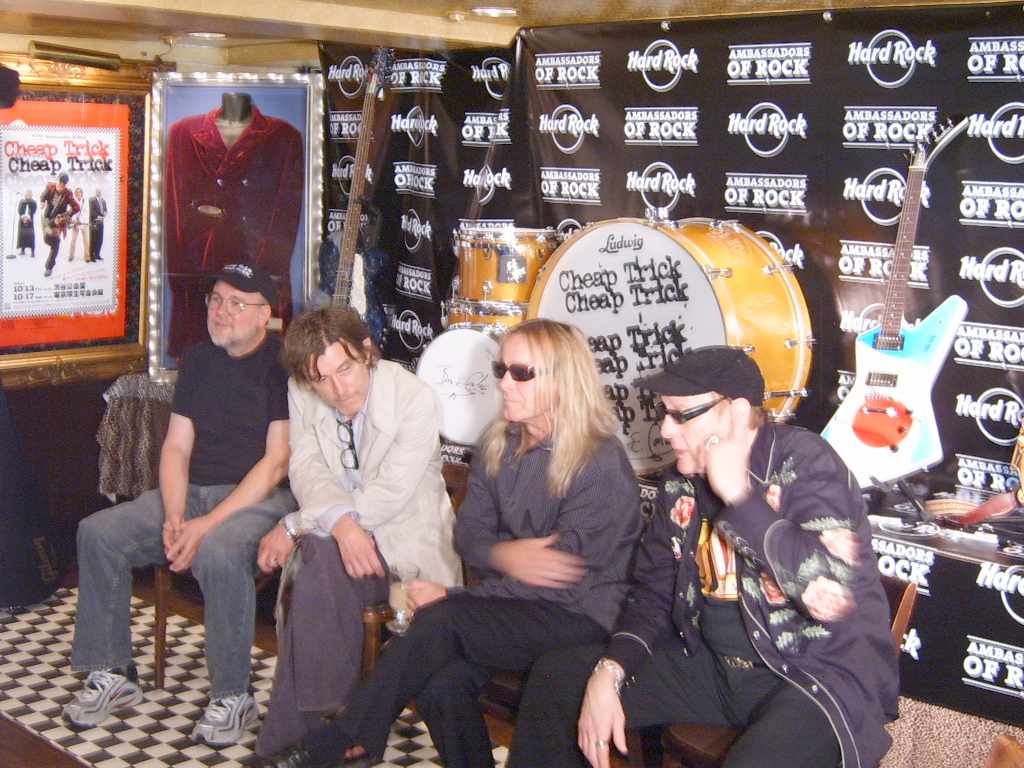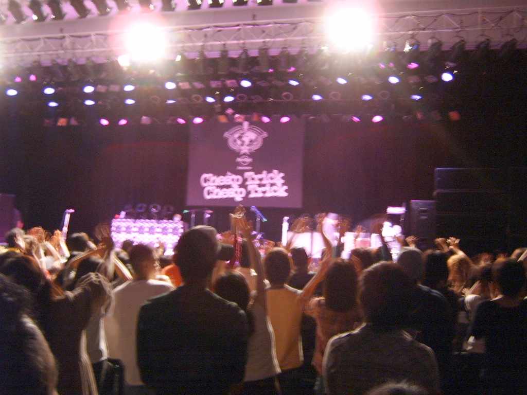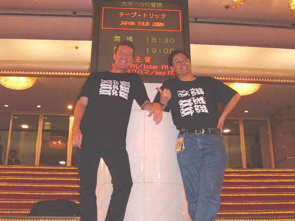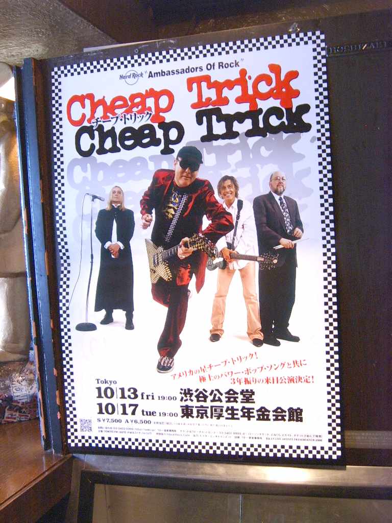 Police, Auf Wiedersehen*, Goodnight Now* During "Hello There", two 6x logo's were projected onto the rear stage screen, whilst during the next song "Big Eyes" there was rotating a checkerboard design. During the second song Rick broke a string on Uncle Dick but continued with that guitar, handing it to a fan at the front at the end. The Japanese crowd were reservedly enthusiastic during the songs and would clap loudly at the end of each song, but curiously the applause would die away and you could then almost hear a pin drop in the polite silence before the next song or before Rick started talking to the audience. A very Japanese phenomenon. After "Big Eyes" Rick greeted the crowd with an "Ohiyo Gozaimas" and "Konnichi wa" before stating in English "Its good to be back in Tokyo" which brought a cheer from the crowd. He also mentioned the new album "Rockford" as well as "Live at Budokan" before introducing the next song as being from "our first album before we were born and before most of you were born!" The band then went into "Oh Candy". After that song, Rick had the lights turned up and mentioned that there were friends in the crowd "from Budokan days from Summersonic days from Nagoya from Nashville " He also mentioned that Scott Ian from Anthrax was here, "we're going to see him tomorrow". The band then went into "Welcome to the World", after which Rick briefly continued in a high voice "Welcome to Tokyo!" He also thanked Mr Udo for bringing Cheap Trick back to Japan one more time, also the Hard Rock Café. He added "But more important Thank YOU Japan was our first home and hopefully our last home". The band then went into "If You Want My Love". "Perfect Stranger" was a nice surprise to hear next, as its been dropped from the setlist in the US. Rick played the yellow Rockford guitar, and at the end of the song passed it to Cheap Track's Sushi Man in the front row. Rick mentioned Cheap Track, saying "Their material is great!" He then introduced the next song as being "a nice slow one off of our last CD" and the band launched into "Best Friend". That was long and monster as always, and maybe it was my ears but I heard much of Tom's bass line through this much clearer than usual. During the crowd pleasing "I Want You to Want Me" it was fun to see Rick playing up on his steps whilst Tom stood nearby, smiling up at Rick as if in awe. After that song Rick announced that the band hope to be back in 2008 and play back at Budokan, adding that the bands first tour of Japan was back in 1978. He then introduced "A living legend, and former resident of the great city of Tokyo, Japan Mr Tom Petersson!" (One day I must ask Tom if there is anywhere in the world that he hasn't lived, however briefly!) Tom played a bass solo for a minute, which I found out a few days later was from Jimi Hendrix's "Burning the Midnight Lamp", before launching into "I Know What I Want". At the end of the song, Rick noted that Tom's cousin was out in the audience somewhere. Someone in the crowd shouted out "He's a Whore" to which Rick quickly replied "Yes he is a whore but he's still in the band!" He then introduced Robin as being "the best rock vocalist there ever was and ever will be", following which the band went into "Voices" and then "If It Takes a Lifetime". In the quiet after that, there were a few calls of "Robeen" and "Bun Eeee", to which Rick comically replied "Asimasan?" Rick then noted that his son Aaron was here, and Rick also mentioned stage monitor man "Steve". After much persuasion, "Steve" reluctantly came out, and turned out to be a Japanese crew member "Finally we have someone good on our crew" quipped Rick, before mentioning some of the regular American crew. After "The Flame" Rick announced that "We're in Tokyo tonight, back in Tokyo another night in Nagoya Osaka and the last day of the tour at the Hard Rock Narita". The band then went into that "70's Song", during which a psychedelic moving design was projected onto the backdrop. "Surrender" was the usual crowd pleaser, and saw two lots of the 6x logo projected onto the backdrop. One of Rick's ending lines was "Scott's alright", and at the end of the song he passed his heavy 5 neck to a fan in the front row. Robin took the mic to say "Thank you for having Cheap Trick, Domo Arigato we really appreciate it". After calls from the crowd in the dark, Rick came back on to ask, as usual, "Does that mean you want to hear some more? Are you SURE you want to hear some more?" Yes, tonight's Tokyo crowd was sure! The band played "Dream Police" with checkerboard and CT logo's swirling on the backdrop. After that, Scott Ian from Anthrax came out with guitar, and joined the band on "Auf Wiedersehen". That was the highlight of the show in my opinion. Scott was very obviously enjoying himself, Tom was very animated and beaming at Scott throughout the song, and Rick was trying to get Scott to ham it up throughout! A fun time was had by all! At the end Scott went to leave the stage, but was prevented from doing so and "persuaded" to stay on for "Goodnight Now". Interesting to see Rick playing a new, smaller checkerboard 5 neck guitar hmmm, where did that come from? The song saw 3 endings, and the show was over at 8.30pm. Which reminds me to mention that shows tend to start early here, hence you do see many people coming straight to the venues from their work, still wearing office suits and smart outfits. I should also note that before leaving England 8 days ago I'd had an ear infection, and despite medication my hearing was still messed up in one ear. So whilst I thought the sound at this show wasn't good, I knew my hearing problems didn't make me a reliable judge. However, a number of Japanese fans afterwards also remarked on the poor sound, which was a shame. Overall I thought this tour opener had been solid without being outstanding. Maybe the sound or the venue took a bit of an edge off the performance? But Friday wasn't over by a long way. After hanging around ta