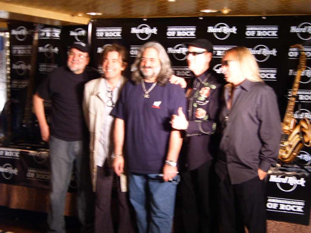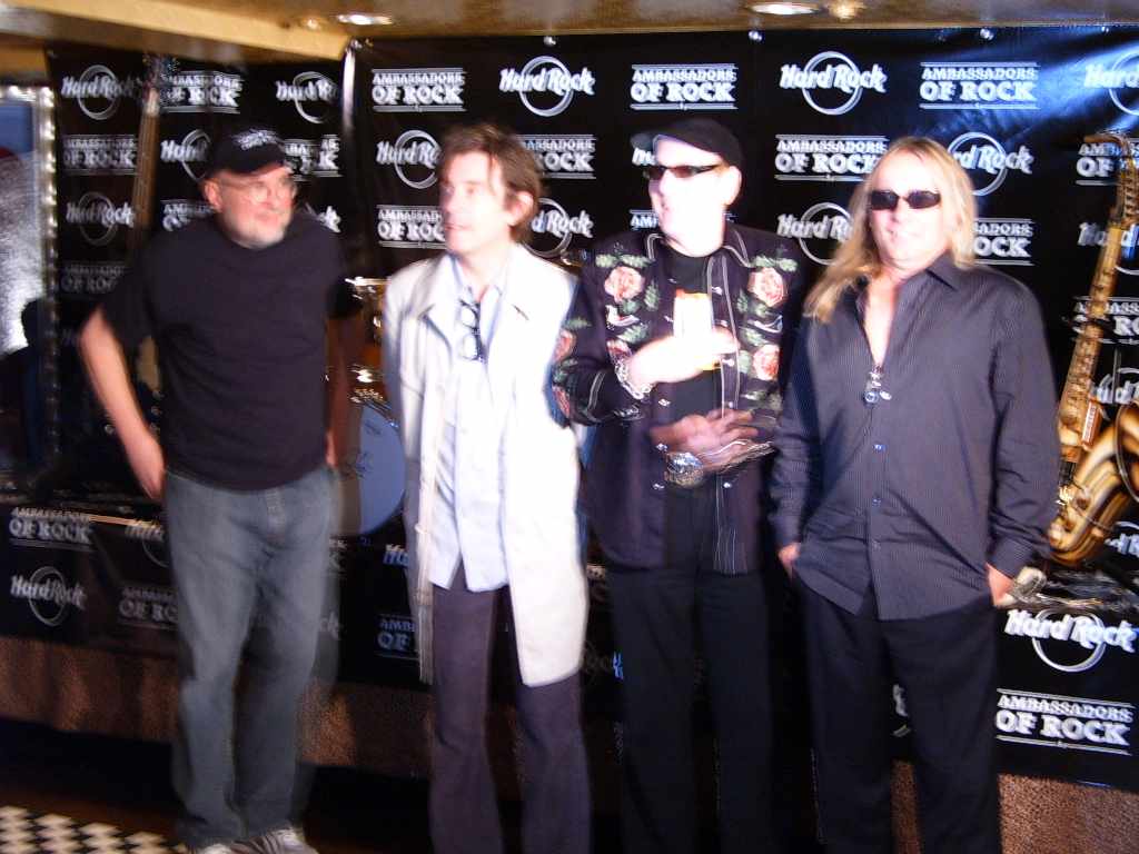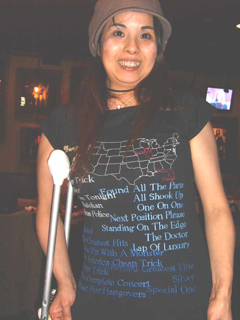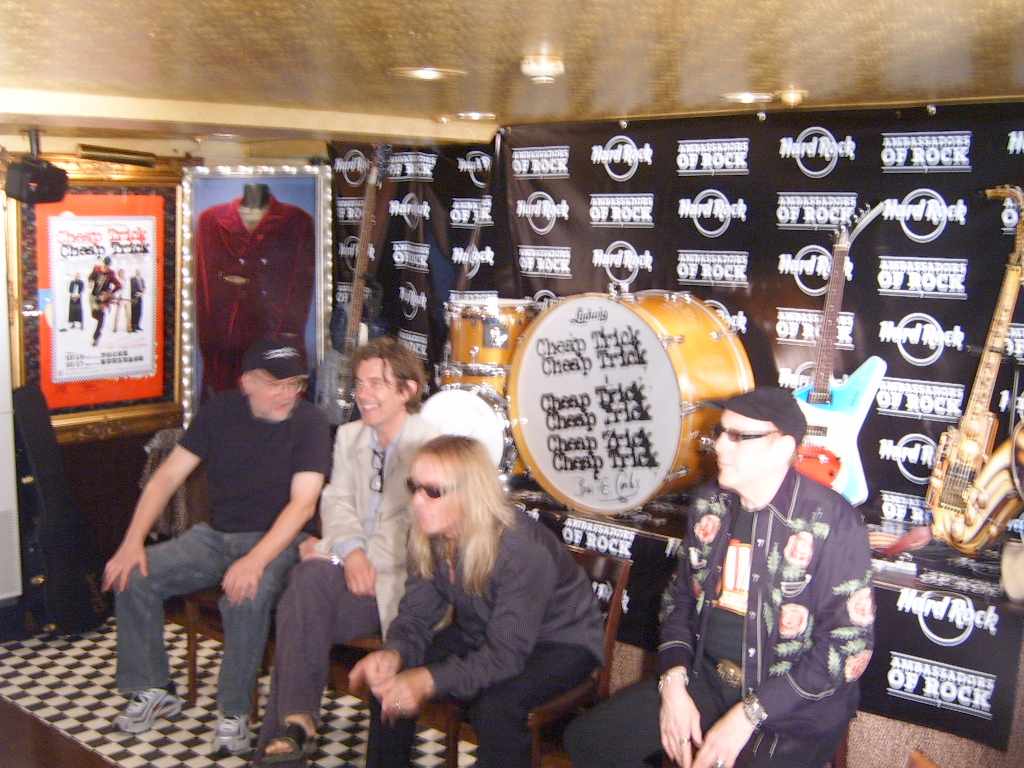 Police, Auf Wiedersehen*, Goodnight Now* During "Hello There", two 6x logo's were projected onto the rear stage screen, whilst during the next song "Big Eyes" there was rotating a checkerboard design. During the second song Rick broke a string on Uncle Dick but continued with that guitar, handing it to a fan at the front at the end. The Japanese crowd were reservedly enthusiastic during the songs and would clap loudly at the end of each song, but curiously the applause would die away and you could then almost hear a pin drop in the polite silence before the next song or before Rick started talking to the audience. A very Japanese phenomenon. After "Big Eyes" Rick greeted the crowd with an "Ohiyo Gozaimas" and "Konnichi wa" before stating in English "Its good to be back in Tokyo" which brought a cheer from the crowd. He also mentioned the new album "Rockford" as well as "Live at Budokan" before introducing the next song as being from "our first album before we were born and before most of you were born!" The band then went into "Oh Candy". After that song, Rick had the lights turned up and mentioned that there were friends in the crowd "from Budokan days from Summersonic days from Nagoya from Nashville " He also mentioned that Scott Ian from Anthrax was here, "we're going to see him tomorrow". The band then went into "Welcome to the World", after which Rick briefly continued in a high voice "Welcome to Tokyo!" He also thanked Mr Udo for bringing Cheap Trick back to Japan one more time, also the Hard Rock Café. He added "But more important Thank YOU Japan was our first home and hopefully our last home". The band then went into "If You Want My Love". "Perfect Stranger" was a nice surprise to hear next, as its been dropped from the setlist in the US. Rick played the yellow Rockford guitar, and at the end of the song passed it to Cheap Track's Sushi Man in the front row. Rick mentioned Cheap Track, saying "Their material is great!" He then introduced the next song as being "a nice slow one off of our last CD" and the band launched into "Best Friend". That was long and monster as always, and maybe it was my ears but I heard much of Tom's bass line through this much clearer than usual. During the crowd pleasing "I Want You to Want Me" it was fun to see Rick playing up on his steps whilst Tom stood nearby, smiling up at Rick as if in awe. After that song Rick announced that the band hope to be back in 2008 and play back at Budokan, adding that the bands first tour of Japan was back in 1978. He then introduced "A living legend, and former resident of the great city of Tokyo, Japan Mr Tom Petersson!" (One day I must ask Tom if there is anywhere in the world that he hasn't lived, however briefly!) Tom played a bass solo for a minute, which I found out a few days later was from Jimi Hendrix's "Burning the Midnight Lamp", before launching into "I Know What I Want". At the end of the song, Rick noted that Tom's cousin was out in the audience somewhere. Someone in the crowd shouted out "He's a Whore" to which Rick quickly replied "Yes he is a whore but he's still in the band!" He then introduced Robin as being "the best rock vocalist there ever was and ever will be", following which the band went into "Voices" and then "If It Takes a Lifetime". In the quiet after that, there were a few calls of "Robeen" and "Bun Eeee", to which Rick comically replied "Asimasan?" Rick then noted that his son Aaron was here, and Rick also mentioned stage monitor man "Steve". After much persuasion, "Steve" reluctantly came out, and turned out to be a Japanese crew member "Finally we have someone good on our crew" quipped Rick, before mentioning some of the regular American crew. After "The Flame" Rick announced that "We're in Tokyo tonight, back in Tokyo another night in Nagoya Osaka and the last day of the tour at the Hard Rock Narita". The band then went into that "70's Song", during which a psychedelic moving design was projected onto the backdrop. "Surrender" was the usual crowd pleaser, and saw two lots of the 6x logo projected onto the backdrop. One of Rick's ending lines was "Scott's alright", and at the end of the song he passed his heavy 5 neck to a fan in the front row. Robin took the mic to say "Thank you for having Cheap Trick, Domo Arigato we really appreciate it". After calls from the crowd in the dark, Rick came back on to ask, as usual, "Does that mean you want to hear some more? Are you SURE you want to hear some more?" Yes, tonight's Tokyo crowd was sure! The band played "Dream Police" with checkerboard and CT logo's swirling on the backdrop. After that, Scott Ian from Anthrax came out with guitar, and joined the band on "Auf Wiedersehen". That was the highlight of the show in my opinion. Scott was very obviously enjoying himself, Tom was very animated and beaming at Scott throughout the song, and Rick was trying to get Scott to ham it up throughout! A fun time was had by all! At the end Scott went to leave the stage, but was prevented from doing so and "persuaded" to stay on for "Goodnight Now". Interesting to see Rick playing a new, smaller checkerboard 5 neck guitar hmmm, where did that come from? The song saw 3 endings, and the show was over at 8.30pm. Which reminds me to mention that shows tend to start early here, hence you do see many people coming straight to the venues from their work, still wearing office suits and smart outfits. I should also note that before leaving England 8 days ago I'd had an ear infection, and despite medication my hearing was still messed up in one ear. So whilst I thought the sound at this show wasn't good, I knew my hearing problems didn't make me a reliable judge. However, a number of Japanese fans afterwards also remarked on the poor sound, which was a shame. Overall I thought this tour opener had been solid without being outstanding. Maybe the sound or the venue took a bit of an edge off the performance? But Friday wasn't over by a long way. After hanging around ta