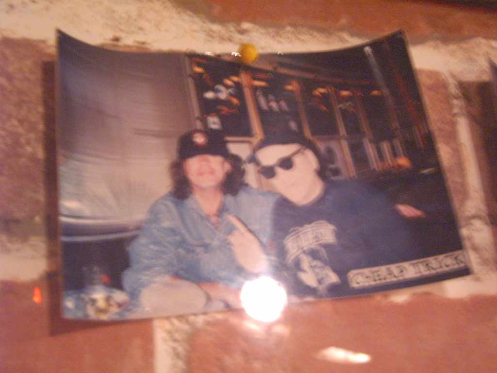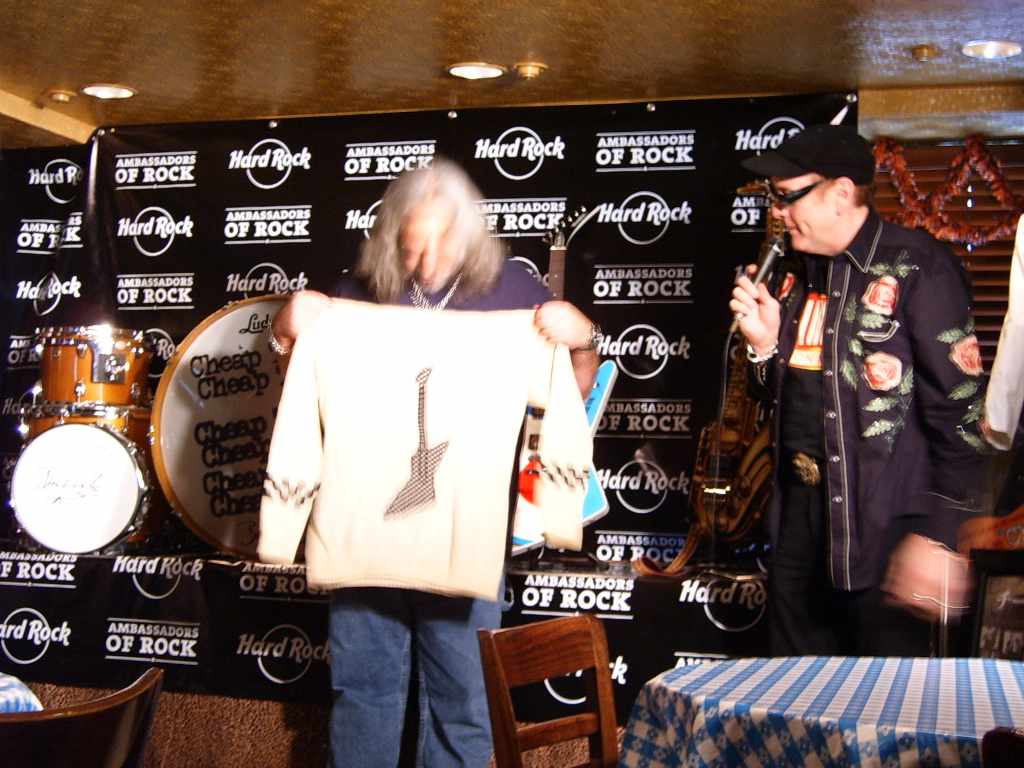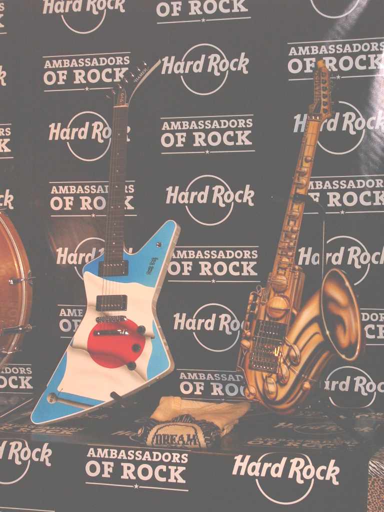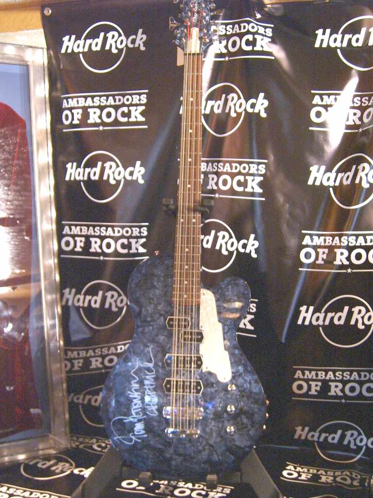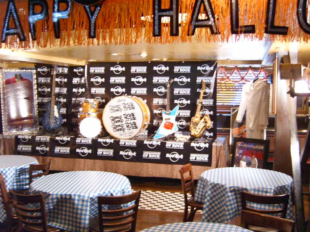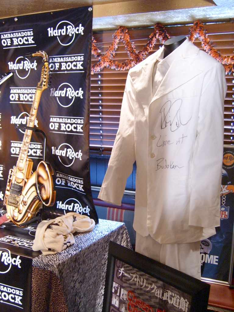 Me, If It Takes a Lifetime, Flame, Surrender, Goodnight Now Next up was "I Want You to Want Me", the first chorus of which Robin sang pretty bluesy (not "Didn't I didn't I didn't I see you crying " but more like "Didn't I see ya cry-in "), though on subsequent chorus he reverted to the standard style. After that, Rick remarked that "Our latest tour ended yesterday, with one more stop here at Narita and we wish this Café a lot of success". He added that "We have a new CD, which is going to be bigger than Live at Budokan (!!) this next song is "If It Takes a Lifetime" like Cheap Trick!" After this song Rick thanked or mentioned several people, including the "Hard Rock chorus for singing the chorus so nicely!" (many of the Café servers and bar staff were enjoying the show too); also "Don Bernstine, "for creating the Hard Rock Café and Rock & Roll single handedly!" (Don was here tonight); Hiroshi, Steve the monitor guy and ending with "Thanks to our road crew for getting drunk every night!" The band then played "The Flame". Rick then said they had time for one more song, and that Bun E was going to China to do a drum clinic "teaching drumming to millions of Chinese!" After a few more words, Rick noted that "Something fell off not my chimpo! or maybe it was!" That somewhat suggestive comment caused some laughs as Rick and his tech messed with something around his person, Rick adding "Asimasen my chimpo did fall off!" Being just a few feet away, I'm happy to report that Rick's "chimpo" was something technical rather than something personal! By the way, what is a chimpo anyway ? The band then played "Surrender", followed by "Goodnight Now" (which wasn't on the setlist) with 3 endings, and the set finished at 7.32pm. It had been a nice, relaxed acoustic set by the band, and they looked to have enjoyed playing that way for half an hour. The band retired to a side room, whilst the tech's set about dismantling the equipment, the Café staff set about restoring the restaurant for customers, and Don Bernstine was interviewed in front of the rapidly dismantling stage. It was appropriate that with CT having played this "Opening Party", that there were several CT items permanently on display on the walls here. On one of the main walls were three items together - a Filmore, San Francisco "Budokan show" poster from April 98 signed by Tom; a picture of Rick from around 78; and a checkerboard Gibson guitar, beneath which was a plate noting that the guitar was painted and signed by Rick as part of the first, annual "Rock the Cure" celebrity guitar auction at the Los Angeles HRC. But those weren't the only CT items - quite by luck I noticed on a pillar facing the bar a "Dream Police" album Platinum Award, signed by Rick and "Presented to Gregg, April and Baron, Good Luck with the Hard Rock Biloxi". It was nice to mingle with some of the Japanese fans, including a young woman called Hiroko, who was wearing a lovely shirt, hand embroidered front and back with the names of CT's albums plus a US map. That was really impressive! As well as having small TV monitors scattered in the Café, a large video screen was downloaded at the "stage" area and there was a big cheer as the Cheap Trick - HRC performance from 1997 was screened! Gradually band members left, though Robin stayed afterwards for quite awhile, signing lots of autographs and posing for photo's with fans. Six of us left at 10pm to get taxi's to the railway station, and Danny, Pat, Noriko, Mutsumi, Hiromi and I all had a fast beer (bought from the convenience store right next to the station!) to celebrate the end of the evening. We all (except Hiromi) got the 10.31pm train back to Tokyo Station where we said our goodbyes to Noriko and Mutsumi. Danny, Pat and I caught the same subway train, and as we got off before him, I do hope Danny remembered to get off at Shinjuku! Thursday-Friday, 19-20 Oct - Travelling home (via Hong Kong, Amsterdam and Manchester) My own personal magical mystery tour! Well, for the last morning in Tokyo, I repacked and we had a wander (and early lunch) just in the area near our hotel before checking out of the room at noon. It was yet another warm and sunny day, and I was reminded of similar weather for my first trip to Japan back in 1999, also in October. We caught an airport shuttle bus back to Narita early afternoon, and checked in with our respective airlines. After enduring long lines to go through security and immigration, we eventually caught up again airside before I had to board my plane for Hong Kong, whilst Pat was flying directly back to Chicago. My United flight took off at 6.25pm, and it was clear enough en-route to see the lights of Taipai and other places below. I landed at Hong Kong at 9.20pm local time, had to wait awhile for my cases to arrive on the carousel, and then had a frustrating time finding the free shuttle bus to my nearby airport hotel. I eventually found the desk dealing with that, had to wait another 25 minutes, and found that myself and others going to the hotel had to load our suitcases onto the minibus front seats and squeeze ourselves in around them. Very odd. It was as warm and humid as when I'd left last week, and it was good to finally reach the hotel, check-in and get to my room by 11.30pm. The room was really nice, but expensive for the 7 hours I'd be in it. C'est la vie I was up at 6am Friday morning after a few short hours of sleep, and got the 7am shuttle back to the airport. I was quickly checked in for my KLM flight to Amsterdam (in Economy this time). After some time in the lounge, I boarded the plane at 9.30am to find that I'd been given a mid-row seat rather than an aisle seat as I'd booked weeks ago :-( The 747 took off at 10.32am, and the large man next to me was asleep for most of the 12 hour flight so it was nearly impossible to get out to move around or use the toilet. In fact, I only managed to get out twice in 12 hours, grrrr! It was mid afternoon local time when we landed a