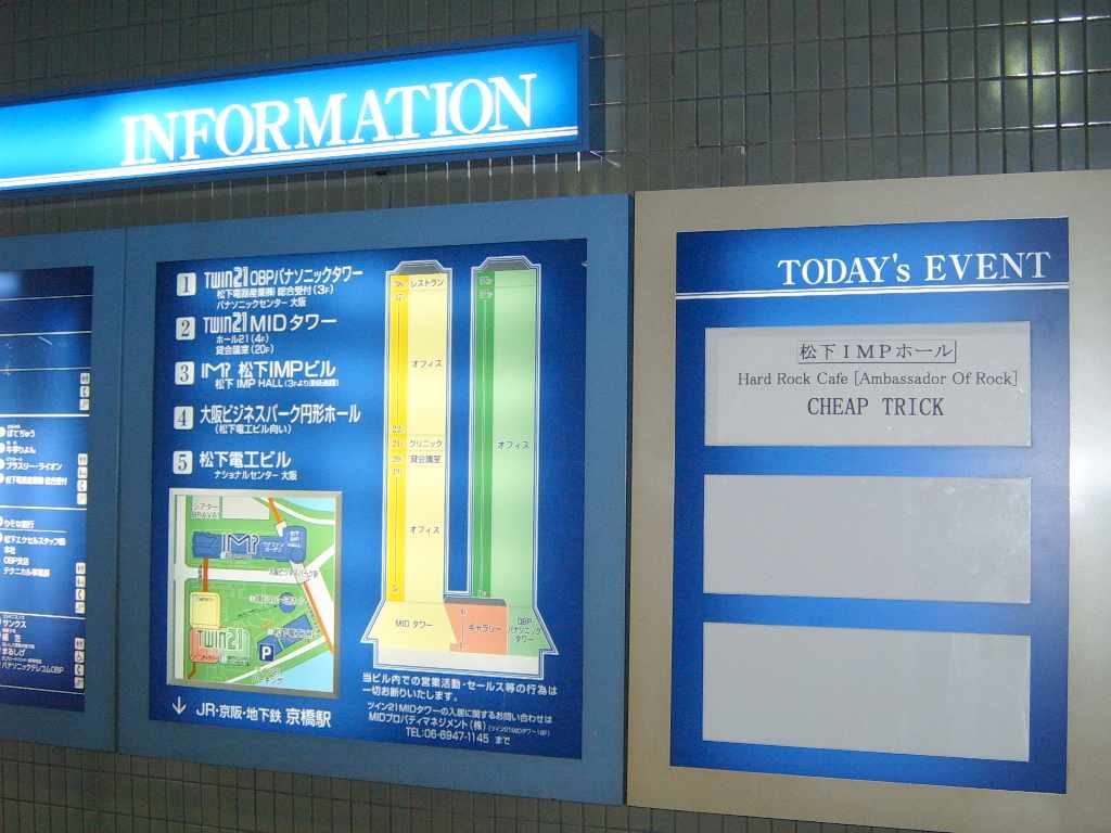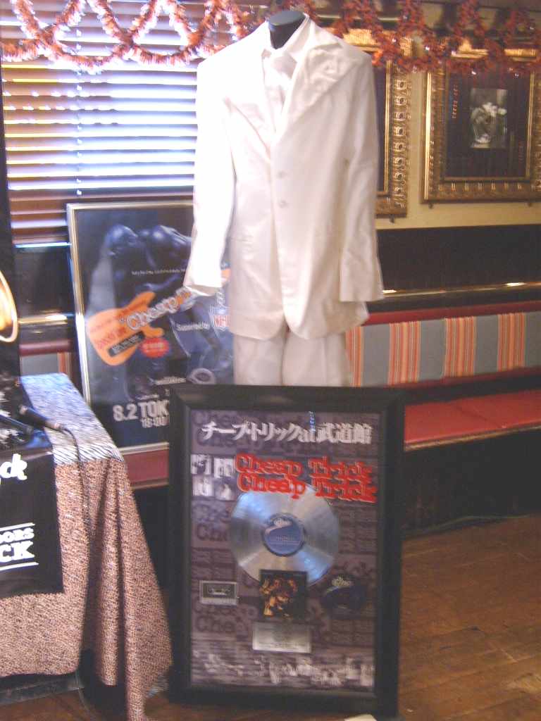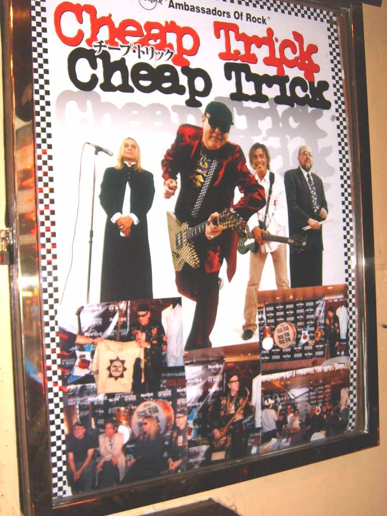 (encore) Dream Police, Auf Wiedersehen, Goodnight Now After "Welcome to the World" Rick announced "Before I forget, hello to our friends from the Hard Rock Café", to which there was no applause. Nor to mention of the promoter, Mr Udo. Rick then asked the crowd if they felt like singing tonight, adding "this couldn't be Live at Budokan but live at Osaka-kan!" The band then launched into "If You Want My Love", which got much of the crowd singing along. Afterwards he congratulated the crowd, "Nice voices, Osaka". He then added "The next song we're going to do is from " and he held up the Rockford guitar. "This one's called you'll hear it in a minute!" It turned out to be "Come On Come On Come On". At the end of that song Rick gave the guitar to a fan in front, but it was quickly retrieved by Rick's tech Wookie. Rick said a few words to him, and he removed the strap and gave the strap back to that fan, which brought an envious sigh from the crowd. Rick got it back and like at Nagoya last night, he sent to guitar on its way into the crowd. The band started playing "I Can't Take It" whilst the Rockford guitar was meeting many delighted residents of Osaka, and a couple of us kept track of its travels during the song. Aaron eventually got it and returned it to Wookie sidestage. "I Want You to Want Me" had the crowd all jazzed up as always, and afterwards, Rick introduced Bun E and a sort of Bun E chant/clap started in the crowd. Rick also noticed a "Congratulations, 30th Anniversary" sign in the crowd, "Happy Birthday to Cheap Trick!" he noted. He then started a short bout of synchronished Japanese clapping, then introduced "The inventor of the 12 string bass guitar, the biggest fan of Osaka Japan, and wearing a shirt bought in Osaka in err 1977! Mr Tom Petersson!" Tom again did the Jimi solo before starting up and singing "I Know What I Want". After the applause for that song had died down, there a very quiet pause, prompting Robin to go "shhhhhh . Be vewy vewy qwiet" in an Elmer Fudd style whisper! Rick added "Like Robin said, be very, very quiet well, not that quiet!" Robin then briefly strummed his guitar and Rick did some "yeah's!" along with that, all very impromptu Robin and Rick then proceeded to bow in turn to each other several times like in some comedy skit! They were obviously having fun. For "Voices", Rick played the safely returned yellow "Rockford" guitar, but it went back to Wookie at the end! After "If It Takes a Lifetime" Rick asked "Is it hot up here? Hai" and he flicked some sweat out to the crowd! He had the lights up and pointed out soundman Bill. There was no applause. He then pointed out soundman Larry. Silence again, or as Rick noted "even less applause". He then said "Steve" Come out!" After two nights of attention, Japanese "Steve" knew what was expected and he came onto the stage and briefly spoke in Japanese. Rick jokingly noted "Finally we got someone good with us on our crew" and started giving a somewhat garbled explanation of why the real Steve wasn't here. He then got "Steve" back out again, and made him again speak to the crowd. Both Rick and Robin held him and Robin asked "What's your favourite rock band?" to which he quickly replied "Cheap Trick!" With smiles he got released, and Rick announced that "The next song features Steve's new best friend, Mr Robin Zander!" The band then played "The Flame", with Rick having to change guitar mid-song. The set closed with "That 70's Song" followed by "Surrender", and I wondered if one of the 5 necks was slightly out of tune or maybe it was Rick playing a bad note or two! When coming on for the encore Rick again threw out his used water bottle into the crowd. He then fired up the crowd with "Does that mean you want to hear some more?" and "Are you sure you want to hear some more?" He then excitedly pointed out on stage "Tom Petersson!". Then "Bun E Carlos!". Then "Robin Zander!" and pointed into the crowd on his side of the stage and lo, Robin had gone off stage and come back into the venue through the side door and into the crowd! I've never seen that before, and Rick helped Robin up onto the stage. The encore was "Dream Police" followed by "Auf Wiedersehen" and ending with "Goodnight Now" with Rick playing that Fernandes 5 neck. The song saw five, yes FIVE endings, and Rick milked the goodbyes before leaving the stage! The show ended at 8.23pm. Afterwards Mari and a friend took us to the small "Silver Spoon" sports/music bar somewhere in the backstreets of Osaka, as it was "Cheap Trick Night" there! Well, it wasn't crowded, but it was fun. There were a couple of big screens showing CT video's which we watched whilst eating snacks and drinking beer. The small bar had mostly KISS memorabilia on display, but also various LP covers by other bands on one wall, including Cheap Trick's "Dream Police". It was fun, and we got back to our hotel close to Shin-Osaka station around 11pm. Tuesday 17 Oct - Cheap Trick at Shinjuku, Tokyo The home leg of this somewhat frantic tour (travelling wise), and we were heading back up to Tokyo. The morning was warm again, but hazy, and we caught the 9.43am Shinkansen (bullet train) for Tokyo. We'd certainly been lucky a couple of days ago getting a reasonably good view of Mt Fuji, as we didn't see it at all on this return journey. We reached Tokyo Station at 12.45pm and we got a taxi to our hotel, as I just couldn't face the subway with my luggage! One day I'll travel light maybe! We left mid afternoon for Shinjuku, finding the venue around 3pm, but there was no sign of much activity. The front of the venue was built into an office building, inside the glass doors were Vegas type maroon carpeted stairs with lighting to each stair. There was also a small, electronic sign near the head of the stairs advertising the show. With things quiet, Mari, Pat and I decided to use the opportunity to eat so ate at the nearby "Wellness Burger" café. I felt very well afterwards. The band arrived for soundch
