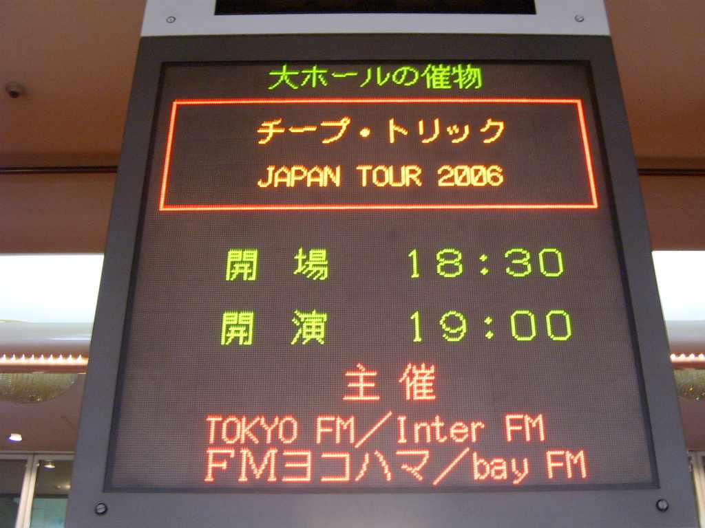 FROM ROCKFORD TO TOKYO CHEAP TRICK IN JAPAN, OCT 2006 Introduction As day follows night, then generally a Japan tour follows a new CD release by Cheap Trick. Well, pretty much. With "Rockford" being released in June 2006, it was mainly a case of "when" rather than "if". The initial news came through from Japanese fans in early Sept that the band were being advertised there as playing four dates in October, in conjunction with the Hard Rock Café's "Ambassadors of Rock" celebration during 2006. Well, I'm always ready to go back to Japan. I've attended the last three Cheap Trick tours there, and its an amazing place to visit, plus I have a number of great Japanese friends who have always been generous enough to help me with some of the practicalities. But this trip for me came about in an odd, and (in terms of the CT tour) somewhat fortuitous way, as I was already scheduled to be in the Far East around that time. It's been a very weird and stressful year for me at work, with the possibility of redundancy looming large for some months. During August, I'd decided to book myself a trip away for a few days somewhere new in early October, as I'd either be out of a job by then or still in a job but taking a week off to get away from the workplace stresses. I deliberated on where to go, and ended up deciding on Hong Kong, an interesting place that I'd never been to before. So I used airline miles to book a return trip there from 5-11th October. It was at the Illinois shows in early September that I heard about the Japanese shows in October, and as luck would have it, the first was to take place on the 13th which was two days after I'd been due to fly home from Hong Kong. When I got back to England I called KLM and managed to negotiate a change to my return date from Hong Kong, though I couldn't change my booking to fly home from Tokyo. I'd still have to return from Hong Kong due to some obscure airline rule. So I then set about finding return flights from Hong Kong to Tokyo, with United Airlines beating Northwest quite easily for price. Some good Japanese friends offered help to buy tickets for the shows and book a couple of the hotels, so things were pretty much set. So I had 5 days vacation in Hong Kong, followed by 9 days in Japan for CT shows to look forward to! Thursday-Tuesday, 5-10 Oct - Hong Kong (non-Cheap Trick) I'll try to keep this brief, as the main focus of this (and all my reviews) are the Cheap Trick shows, though I do like to give the travelogue too in order to give the full picture of the trip. And hey, some people might prefer the tourist details to the show reviews, ha! :-) I left rainy Manchester, England on the morning of Thursday October 5th. I was still feeling somewhat odd as for the first time in over 27 years I was unemployed. I'd accepted redundancy from my 25 year civil service career, and left my office on 30th September. I did have a temporary IT job to return to late in October so I had work, of sorts, to come home to. Anyway, work was the last thing on my mind as I sat in my airline seat watching the rain pour down outside. The flight from Amsterdam to Hong Kong left mid-afternoon and flew overnight across Eastern Europe and the vast continent of Asia. Luckily I'd booked a Business Class seat outbound (using airline points), so I was able to relax for the 11 hour flight. I arrived in Hong Kong around 8am local time on Friday morning, and upon leaving the terminal to find the bus service into the city, it felt like I'd walked into a hot, damp oven. The temperature was in the high 80's F and it was very humid too. I got to my hotel slightly north of Kowloon around mid-morning, and they were kind enough to let me check-in and have my room several hours early - I think they took pity on the pathetic, sweaty, tired and rumpled looking figure that presented itself to the smart check-in desk! I think my begging may have helped a little too! I found my room on the 27th floor, showered, and crashed for a few hours. Gosh, I'm rambling already, so let's try to summarise rather than go through this non-Cheap Trick section day by day. And remember, you can always skip all this boring, travel related stuff and head straight down to the shows! Hong Kong is an amazing place. It's hot, humid, chronically overcrowded, grubby in places yet spotlessly clean in others, vibrant, noisy, busy a huge mass of humanity and business crowded into a ridiculously small area. I loved it, though I don't think I'd want to live there! The amazing harbour vista is breathtaking, looking across from the Kowloon peninsula across to the Hong Kong island shore. It was wonderful to sit at the harbour late in the afternoon in shirtsleeves and shorts, wait for dusk to fall and watch the tall offices and hotels opposite light up to create a stunning panorama. One evening I was lucky enough to catch the 15 minute "Symphony in Lights" show at the harbour, during which many of the buildings opposite took part in a light show with choreographed flashing neon, laser beams shooting from their roofs, plus fireworks in the harbour. One day I walked up to The Peak on Hong Kong Island, from where you can get stunning views over the harbour. I had no idea that this is best attempted only if you've first undertaken an intensive, Olympic standard endurance training programme! Talk about hard work, the steeply sloped path just wound up the mountainside relentlessly, seemingly never to end. I'm normally pretty good with lots of walking, but I really struggled. I eventually made it, just, and the first thing I had to do was buy a bottle of chilled water and chug it down in one go! Then buy another! The view from the observation deck is stunning. I went back up again late on an afternoon to see the view at night this time I took the tram up which was much easier! On the way from the airport you pass some of the dockside, and you see the largest container port you'll ever see. I've never seen so many of those metal containers