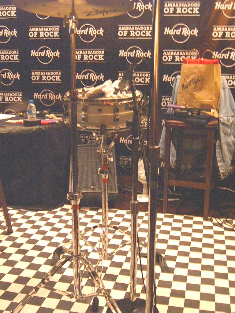back comfortably. It was nice to get to bed around midnight! The last full day in Japan, the time had just flown by, not only in Japan but for my whole trip. We didn't really manage to do much during the nice, warm but hazy morning. We went to Tokyo Station and spent time investigating trains to/from Narita station (not the airport but the town) for tonight's Hard Rock Café appearance by the band). After that we went to the Ginza and walked a bit along that, seeing the grand Kabuki-za Theatre in amongst all the expensive designer stores. We agreed to meet Danny at his hotel and all take the train together to Narita except I misunderstood where his Shinjuku hotel was and eventually arrived about 20 minutes later than planned. We rushed back to Shinjuku station in a taxi, got the subway to Tokyo Station, and the morning's research and familiarisation paid dividends as we took the shortest route to the correct platform and managed to catch the 3.19pm train to Narita. The sun was shining as the train headed out through the suburbs, stopping at occasional stations, but we made it to Narita in about an hour. We had a little confusion with a taxi driver at the station as to where the new Hard Rock Café was, but we told him the shopping mall in which it is apparently located, and he drove us through narrow streets for several minutes. I must admit to being a little apprehensive about whether we were going to the right place with the language barrier and all, but we reached a mall and we spotted a small HRC sign nearby so happily the taxi driver had brought us to the right place. The Mall was large, clean, bright and spacious, with the HRC located near one entrance. I have to admit that I found it curious that the HRC organisation had put a café here, as it was well away from where tourists would go, and not exactly a short walk from Tokyo Narita Airport either. Hmmm, time will tell as to its success There was a rope barrier already in place outside the Cafe, so that fans would wait in an orderly line, and at 4.45pm we were not the first fans here. There was a nice, framed CT/HRC poster on an easel at the doorway, the same poster as seen in Tokyo. The merchandise store was open, but the Café itself was closed for this "private event", with most attendees having won admission through radio station competitions I believe. This show was an "Opening Party" of sorts, though the Café had actually opened for business a couple of weeks earlier. We were lined up outside as HRC staff and CT's crew were finishing setting up for the bands performance inside. Whilst waiting I did of course shop in the store I'm afraid I do so in every HRC, and my suitcases wouldn't thank me later! The band arrived at 5.40pm, and I gather spent a little time shopping in the merchandise store before going to soundcheck. My hearing was still messed up, but around 6.15pm Danny said he could hear Robin singing "Borderline", followed by "I Don't Love Here Anymore" and "If It Takes a Lifetime". The fans were let in at 6.30pm, and were able to go to a small, makeshift "stage" area, where 4 stools were set up for the band members to sit on whilst they played a short acoustic set. One nice detail was the checkerboard linoleum that had been laid on the "stage" floor. After a short introduction in Japanese, the band came on at 7.01pm. RN - black pants, black t-shirt with some design, black