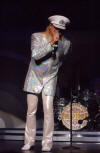 shoes, silver shirt, white jacket with sparkly red trimmings, white cap, shades