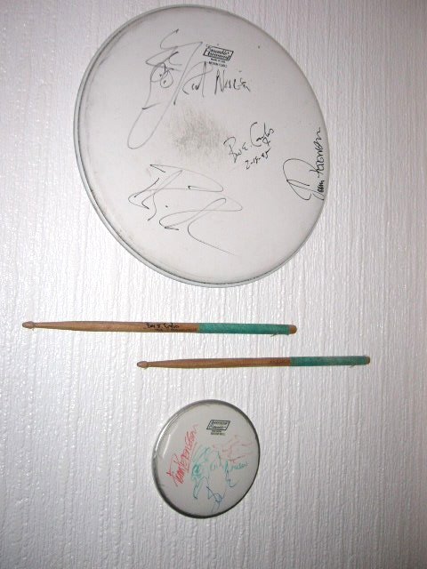 black); six pack cooler, licence plate frame; used & signed drum head; playing cards