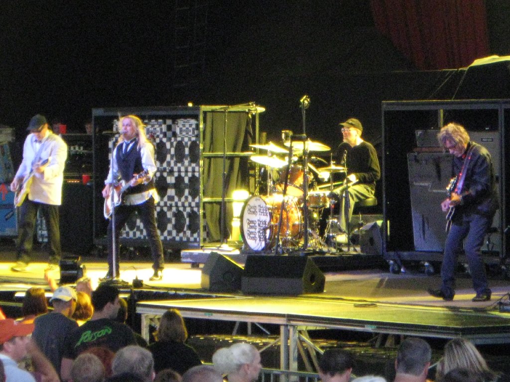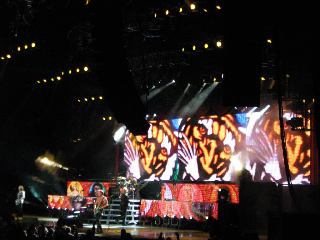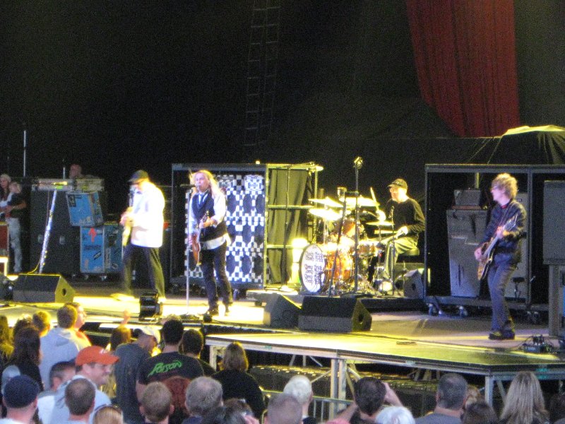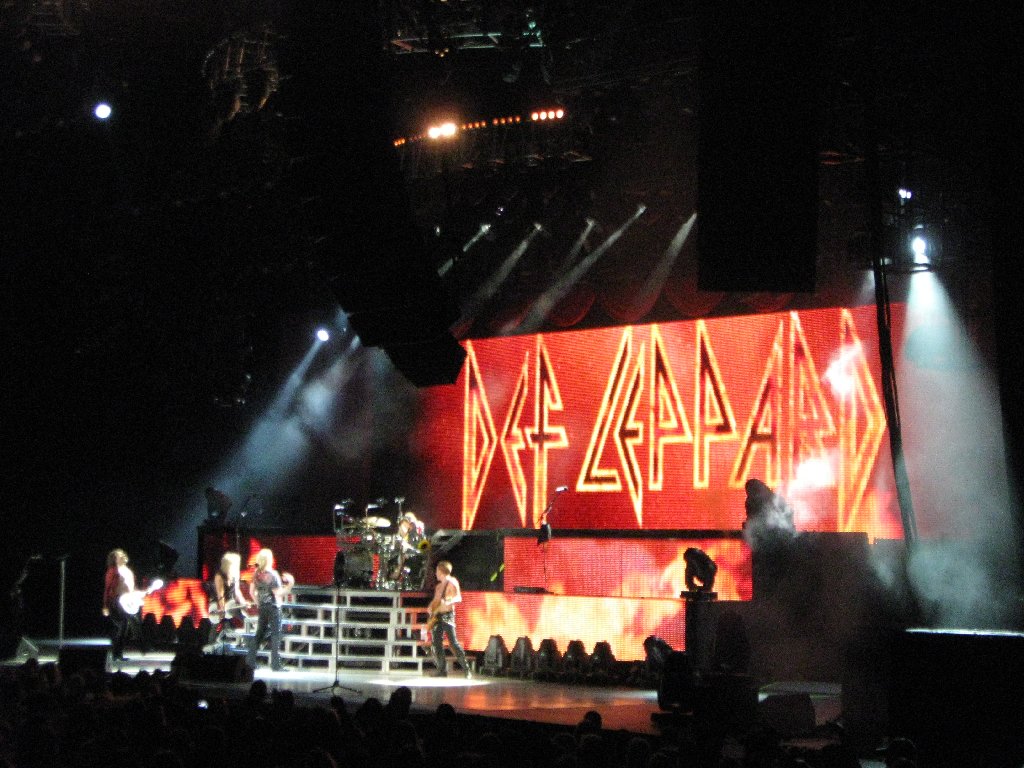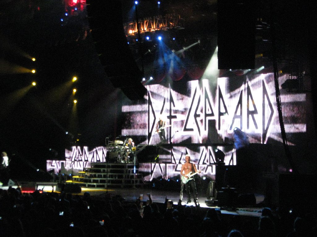 Lilac jacket, white shirt, bow tie, black pants Way of the World, I Want You to Want Me, These Days, She’s Tight, Tonight It’s You, Sick Man of Europe, Dream Police, The Flame, Surrender, Goodnight Now Interesting to see a man come on and play keyboards off to Tom’s side of the stage. It turned out to be one of the bands long time friends, Magic Christian. It was a buzz to hear the band open up with “Way of the World”, a song rarely played in the past 30 years, and this was my first time hearing it played live. By the end of the song, the covered part of the venue was around 2/3 full (with more coming in), so people were keen to see Cheap Trick. To the sides of the stage were two video screens, but no video was projected for either CT or Poison. However, the 2x CT logo was projected onto the stage backdrop throughout the bands set. After a well received “I Want You to Want Me”, Rick greeted the crowd, “Hello everybody, I think you know we are still called Cheap Trick. The next tune is from our new CD which is out next week”. The band then went into “These Days” from “The Latest” CD. This was followed by “She’s Tight” which was well received as an older and better known song. Rick then addressed the crowd again, “Yes folks, we are a real band from Illinois – four great guys, three great chords, Cheap Trick.” He mentioned “… friends from Tokyo, friends on the lawn…” before introducing the band members and Magic Christian on keyboards. He got a big cheer after finishing “Its fun, we’re out on the road with Def Leppard and Poison”. “Tonight Its you” sounded great, and Rick then briefly introduced, “Here’s a new song” with the band going into a rocking “Sick Man of Europe”. Afterwards, Rick again played up to the “local” crowd by noting “Wow! Thank you very much, a good looking audience… you can tell when you get near Chicago!” Hmmm, are Chicago audiences better looking? Discuss. “Dream Police” went over well as always, and it was great to see the band going over far better to this crowd than they had here last year to a crowd of Journey and Heart fans. I guess you could say that fans of Def Lepp and Poison have more taste? After “Dream Police” Rick again got a crowd reaction by saying “Did I mention we’re playing with Poison and Def Leppard?” He added “… later this summer we’re doing a bunch of shows after this tour is over. We’d like you to see us with an orchestra” – obviously referring to the run of Sgt Pepper shows in Las Vegas in September. “The Flame” was a crowd pleased, as was “Surrender”. After that, Robin thanked the crowd copiously, adding “… we’re Cheap Trick, goodnight everybody”. The band launched immediately into “Goodnight Now” with 3 endings, and were given a great reception at the end from the nearly full audience. They had played a nice 40 minute set, including a couple of new songs along with the favourites that the majority of the crowd would recognise. They’d also been animated on stage, relaxed and looking like they were enjoying themselves, and they hopefully won over some new fans. Cheap Trick’s set finished at 7.40pm, and after a quick stage clearance, Poison came on at 8.05pm to a very warm welcome. As a Cheap Trick fan it was a little disappointing to see Poison get a bigger and louder reception than CT, but I guess it showed that the promoters got the billing right, sadly. What can I say? The crowd were wild for Poison, though I felt they were locked in the 80’s. They used pyrotechnics, guitar and drum solo’s and lots of high-fiving by Bret Michaels with those standing to the front of the stage. The crowd loved them, I didn’t, end of story. Poison finished just before 9pm, and it only took 30 minutes for the stage to be cleared and readied for the headliners. As we’d seen in Australia, the show opened with a short part of the British national anthem (I guess I was the only one who sang along with that) before a short video montage which ended with the words “That was then, this is now…” The crowd went nuts, even more so than for Poison. As I said in my Australia review late last year, Def Leppard are the consummate big arena band, playing catchy, anthemic songs and using impressive video background and lighting for every song. Joe Elliot’s voice sounded a little better than in Australia, though I have to say that "our singer is still better than their singer" :-) The crowd loved them, and I have to say that I enjoyed them too. We