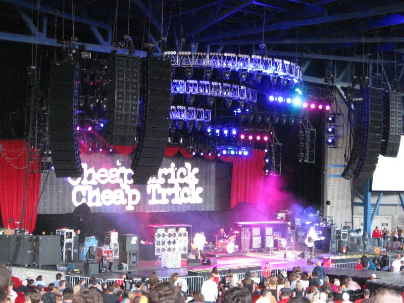 later we were back at Patricia’s home. Sat 18 July – Cheap Trick at Milwaukee, WI Saturday morning was nice, warm with some occasional sunshine. However, we drove into threatening clouds on our way up to Milwaukee during the afternoon, and it was lightly raining by the time we parked under the elevated 794 highway, next to the Marcus Amphitheatre. We got there at 5pm, so had a bit of a wait before the gates opened to the amphitheatre. However, merchandise was on sale, plus the “Cheap Trick truck” (see my review of the Elgin show last December) was on display near the gates. Plus, we got to hang with an old CT buddy, John G. I rarely get much time to speak to John at shows so that was a bonus. The Marcus Amphitheatre was similar to the one last night at Tinley Park, though I think with a little less covered seating and more lawn area high up to the rear. As last night, the audio montage started at 6.57pm with Cheap Trick hitting the stage at 7pm. RN –
