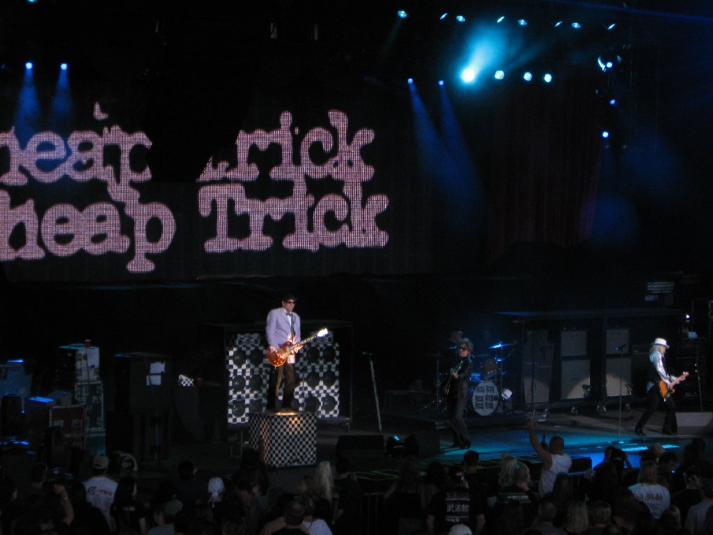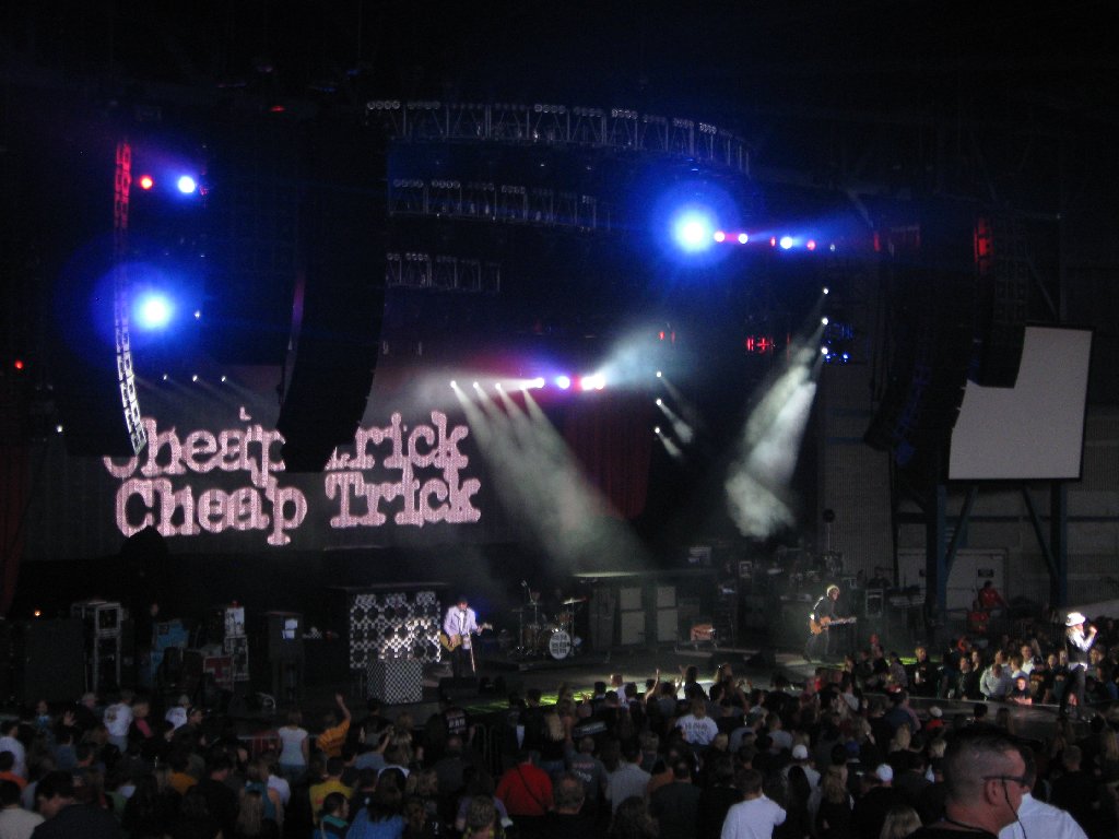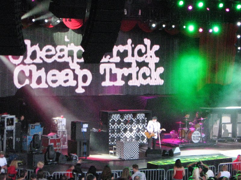 For the second summer in a row, Cheap Trick were embarking on a long summer tour as part of a three-band bill. In 2008 they were supporting Journey and Heart, neither of whom much appealed to me. I went to one show on that tour, at Tinley Park near Chicago watched Cheap Trick, saw the latter part of the Heart set and the first three songs of Journey before leaving. The 2009 summer tour was more attractive. Although again the opening act of the three, the headliners were Def Leppard, one of the most accomplished arena rock bands around. Having seen them a number of times over the past 3 years where Cheap Trick have supported them (in the UK in 2006, then five of the shows in Australia in 2008), I’ve grown to enjoy their shows. The middle band in the sandwich were Poison, who I have no particular feelings for either way, but who were I think buoyed by the recent success of Bret Michaels’ reality TV show in the States. Anyway, a more attractive triple bill for this summer, and so I chose to take in two shows. Both would be in the Midwest, at Tinley Park near Chicago and then Milwaukee. Thurs 16 July – Travel to Chicago As usual my travels took me to Chicago via Amsterdam on my airline of choice, KLM. And the miles from this transatlantic trip would see me reach Platinum status level again for the 10th successive year hence finally earning me “Platinum for Life” status with Air France/KLM! Well, with the economic crisis hitting the airline industry, who knows what “Life” means? Enjoy the benefits whilst it lasts I guess. Not much else really to say about the travelling that I haven’t written many times before. I had to be up at an unearthly hour (2am actually) to get to Manchester Airport to catch my 6.10am flight to Amsterdam. My morning flight from Amsterdam to Chicago was a little more comfortable than usual. Although I was flying economy, KLM opened up the front Business Class cabin of the 747 to their frequent fliers. A sign of the economic times, that the small number of paying Business Class customers could all be accommodated in the upstairs cabin. Anyway, it was nice to have a wide seat that reclined most of the way back, legroom and personal TV, even if the catering service was economy fare. Despite the comfort I barely slept, as usual. I made it to Chicago at lunchtime on a lovely summers day (it had been cool and overcast at Leeds and Manchester), and the rest of the day was quiet. Fri 17 July – Cheap Trick at Tinley Park, IL Friday started dry and warm, and the morning was quiet. Patricia and I left her house around 2pm to drive to the southern ‘burbs of Chicago and meet up with some friends before the show. It was nice to meet old friends Mary, Dawn and Laurie at a restaurant at Orland Park, and nicer still when Lisa J arrived with Junko and Hiromi who’d landed at O'Hare from Japan only a couple of hours before. I didn’t envy them going straight to a show after such a long journey – I’ve done that a few times and its hard when the tiredness hits! By the time Pat and I left the restaurant, rain was threatening, with some dark clouds overhead. And by the time we parked at the First Bank Amphitheatre 25 minutes later it was lightly raining. Luckily our tickets were in the covered part of the amphitheatre. We had to wait fifteen minutes or so in the rain before the gates were opened at 6pm, a good opportunity to buy tour t-shirts, and also a copy of “The Latest” for only $5. A bargain! And we could also hear CT soundchecking whilst we were outside – “Miss Tomorrow” and the Beatles’ “Getting Better”. That was cool. The amphitheatre was outdoors, with a large covered stage and large area of covered seating. To the rear was the higher up, uncovered lawn area. As I recall it rained when we were here last year from Journey, Heart and CT too. As it was, our seats, though in the covered area, were wet because of the rain blown in by the breeze. Nice to briefly see friends Patrick and John G seated a row behind us, plus Tina just a few seats away. The amphitheatre was half full when an audio montage started at 6.57pm, prior to Cheap Trick taking the stage. That lasted for about 3 minutes, and included clips from things like the Simpsons, Japanese TV and various CT songs. Pretty cool to hear, and like a truncated version of the video montage used before the Budokan 30th Anniversary Show last year. At the end of the audio montage, the band were welcomed to the stage, though interesting it wasn’t tech Dave Rule doing the talking. The welcome was delivered by a well spoken woman’s voice, which made the line “… please welcome to the stage, the best f***in’ band this town has seen” just a tad more shocking! The band took to the stage at 7pm to a warm welcome. RN –