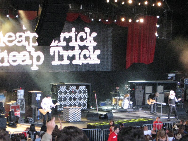 Lilac jacket, white shirt, bow tie, black pants Way of the World, I Want You to Want Me, These Days, She’s Tight, Tonight It’s You, Sick Man of Europe, Dream Police, A Day in the Life, Surrender, Goodnight Now As last night, “Way of the World” was the set opener, and by the time “I Want You to Want Me” was under way the venue was filling up and many fans were on their feet. After “IWYTWM”, Rick announced “Its great to be in Milwaukee once again. I’m not sure if you know, we’re just putting out our 150th album next Tuesday, on CD, LP and 8-track. We know there’s still lots of 8-track players in Milwaukee! Here’s a new one”. The band then went into “These Days”. That was well received, and again it was heartening to see the band getting a warm and enthusiastic welcome. Cool to see Rick use Def Lepps catwalk during “She’s Tight”, as he’d done in Australia when doing the solo intro to “California Man”. Can’t imagine he’d get away with that if this was Aerosmith’s show! At the end of the song he handed off his Uncle Dick guitar to a Def Leppard fan in the front row. He then reminded the crowd “Just in case you’re not sure, we are Cheap Trick! On the drums, Mr Bun E Carlos, the Living Legend. Tom Petersson… Magic Christian…” He then spotted the Trikfan licence plate being held up by local fan Kimberley near the front. He then went on to introduce “Ladies and Gentlemen, my favourite singer in the whole world, Mr Robin Zander.” He added “It’s a pleasure to be playing here with Poison and Def Leppard” which went down well of course. We were then treated to a nice “Tonight its you” and an energetic “Sick Man of Europe” before Rick took to the microphone again. “That’s a new one from The Latest”. He added “Check the website for a special show we’re doing in Madison soon for someone who used to work for us who’s real sick”. He continued “We have friends from Tokyo, Europe… and they’re not just here to see Poison and Def Leppard!” The band played a well received “Dream Police”, after which Rick referred to the bands historic links with this city, “We used to play that a lot in Milwaukee, at the Stone Toad, Humping Hannahs, Dane County Coliseum… no, that’s not here (KG: Its in Madison) … County Stadium... Later this summer we’re doing a bunch of shows with a full orchestra… doing some real great songs. Here’s a little preview”. The band then played a wonderful version of “A Day in the Life” from Sgt Pepper, that was very cool to hear. And as a side note, interesting to note that this song is being covered this summer, not only by Cheap Trick occasionally, but also by Neil Young during his summer tour of Europe. Two album flats were thrown out during “Surrender”, at the end of which Robin thanked the crowd. The band then launched into “Goodnight Now”, which had 4 endings, a couple of which were pretty extended! That was another sign I think of the enjoyment the band were feeling, at the end of another animated yet relaxed 40 minute set. And cool that they got a very warm reception at the end of their set. Poison came on at 8pm, and like last night, the crowd were wild for them. We opted to stand out near one of the bars and chat with friends for most of their set. Went back in for the last 10 minutes, mostly to avoid the crush of people who’d be exiting at the end of Poison's set to find a bathroom or beer or most likely, both. Def Leppard came on at 9.30pm, and got a huge reception. One thing of note was during their set, a firework display took place outside the amphitheatre, which was cool to spot. Again, the Lepp’s got the biggest crowd reception of the night, which was no surprise given their headline status, anthemic set and visually impressive show. Again we left at the end of the main set to avoid the traffic, but heard some of the encore as we walked to the car. We left the venue at 11pm and were back in north Chicagoland 90 minutes later. Sun 19-Mon 20 July – Travel home from Chicago As always, these weekends fly by too fast. After two great shows and good company, it was time to head home and back to a very busy office. The day was dry but cloudy, and my flight back to Amsterdam left Chicago at 4.30pm. Although a busy flight, no upgrade luck. Still, I did have a seat with legroom. As usual I tried to sleep during the 7 hour overnight flight, but with little success. I arrived at Amsterdam at 6.20am local time, didn’t have long for my connection to Manchester, and was back in England at 8.15am. Oddly, it was sunny at Manchester! And from there it was off to get my car and drive into work for the rest of the day, yawn! Thanks! Many thanks as ever to Patricia for her company and hospitality. Many thanks also to Carla and Cheap Trick as always, and thanks to the various friends I met at the shows who all gave me a warm welcome! Hope to see you all again soon! Kim Gisborne, Leeds, England – 2 August 2009 . |