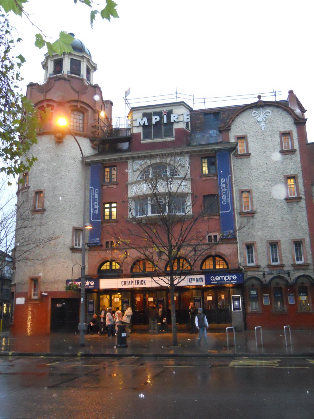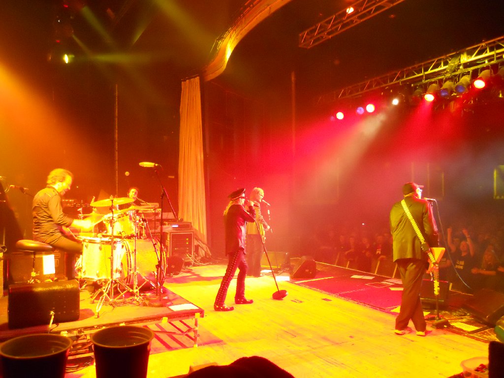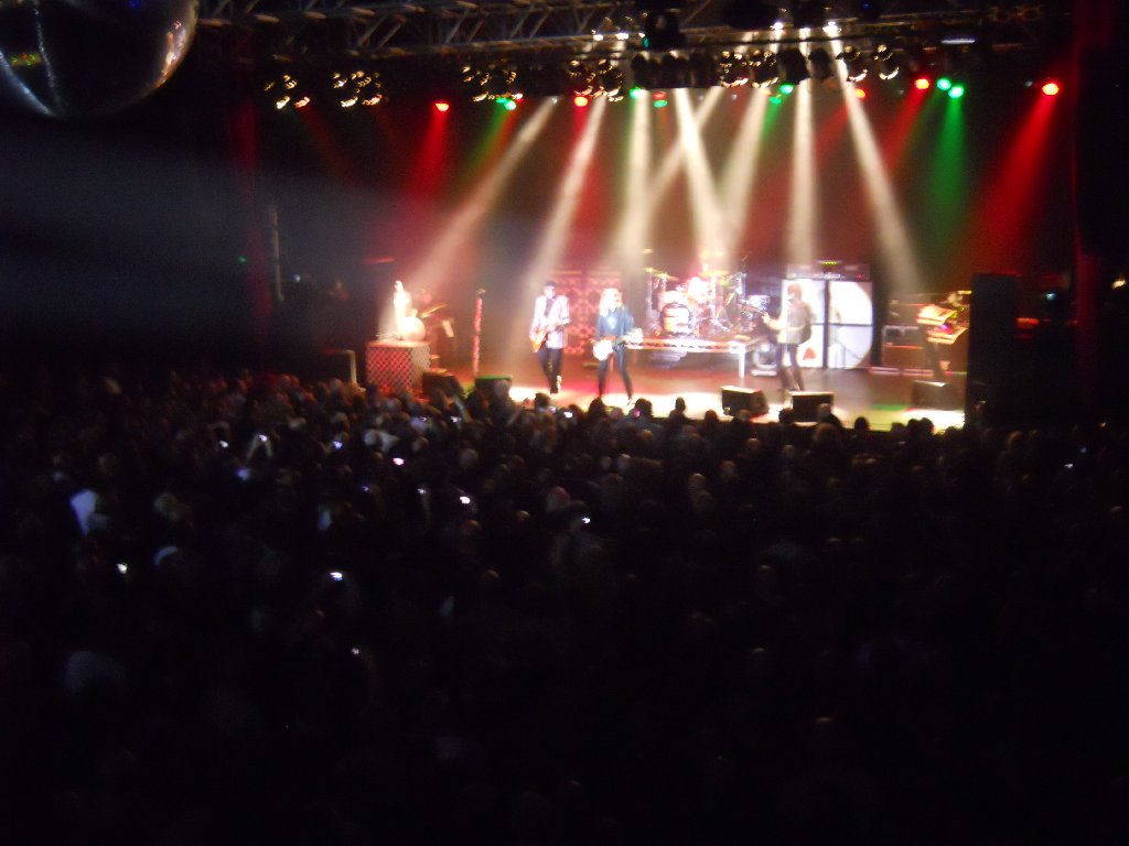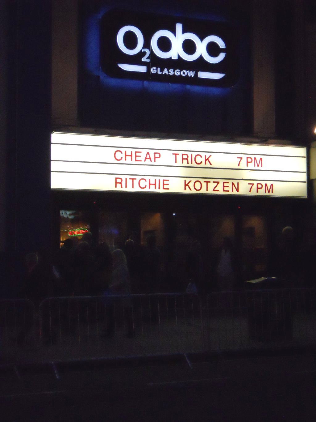 fell in between those dates, so a busy time was guaranteed for the band. Saturday 6 Nov An early start for me to what promised to be a busy week. Girlfriend Patricia was flying over from Chicago for the tour, and was due to land at Manchester at about 7am so I needed to be up around 5:15am to drive the 70 miles to meet her. Her flight ended up delayed by 45 minutes, time which I spent stuck in a diversion through the east Manchester suburbs due to several miles of the M60 motorway being closed for maintenance. Just what I needed. Anyway, I picked her up just after 8am and we drove back to Leeds. The morning was chilly but bright, and the hope was that the sunshine would remain for the coming week. The rest of our day was spent in and around Leeds, changing dollars into pounds, doing some shopping for the road trips ahead, and packing. The schedule meant short stops back here at Leeds, so the more we got ready now, the more time we’d save later! Trust me, you’ll understand as we go along! Sunday 7 Nov – Cheap Trick in Glasgow Not a bad morning weatherwise, dry and cool but mostly bright. We left Leeds at 8:45am and drove north on the 220 mile drive up to Scotland. Some of the English scenery was nice, particularly crossing desolate English moorland on the A66 from the A1 over to the M6. However, some of the scenery in southern Scotland was beautiful, with rolling hills and moors on the M74 before dropping down as we approached the outskirts of Glasgow. It’s a big city, but the M8 motorway took us very close to the city centre and, with the aid of our SPS/satnav unit we easily found the car park close to our hotel before 1pm. As it was too early to check-in, we walked down to Sauchiehall Street to view the venue. We walked into a nearby bar to find some CT friends already there having drinks! We chatted awhile before all getting some lunch at a nearby Italian place opposite the venue. Pat & I went off soon after 3pm to check into our hotel and change, before going back to the venue. Around 5pm inside the O2/ABC, final set up was taking place, both on stage and by the venue staff. The stage was nice and wide, with about 40 ft of main floor in front for standing. There was a raised area with bar to the rear, with a small balcony above that. There was also a small, raised floor area to the right (Tom’s side) of the main floor. The capacity is around 1,500 or thereabouts I believe. Oh, and above the main floor was a huge glitter ball! I hope that was securely connected, I’d hate to be below that if it ever fell! The walls were black, with the stage flanked by deep red velvet curtains, and the venue was up on the first floor of the building. The band arrived around 6pm, and soundchecked from 6:30pm. Interestingly they were joined by an accordion player, who I found out to be Mick MacNeil, a founder member of Simple Minds. The band played “Didn’t Know I Had It”, “Miss Tomorrow” (with accordion), “Miracle” and “Worlds Greatest Lover”. A very nice indication of tonight’s set list. Doors opened soon after 7pm, and the band met a number of British and European fans (in a very crowded corridor) before the show began. The venue was pretty full by the time the audio montage started at 8:38pm. That was followed by that polite, American female voice announcing “Ladies and gentlemen, boys and girls, please welcome to the stage the best fucking rock band this town has ever seen… Cheap Trick”, with the band taking to the stage at 8:40pm to a very enthusiastic welcome. RN –