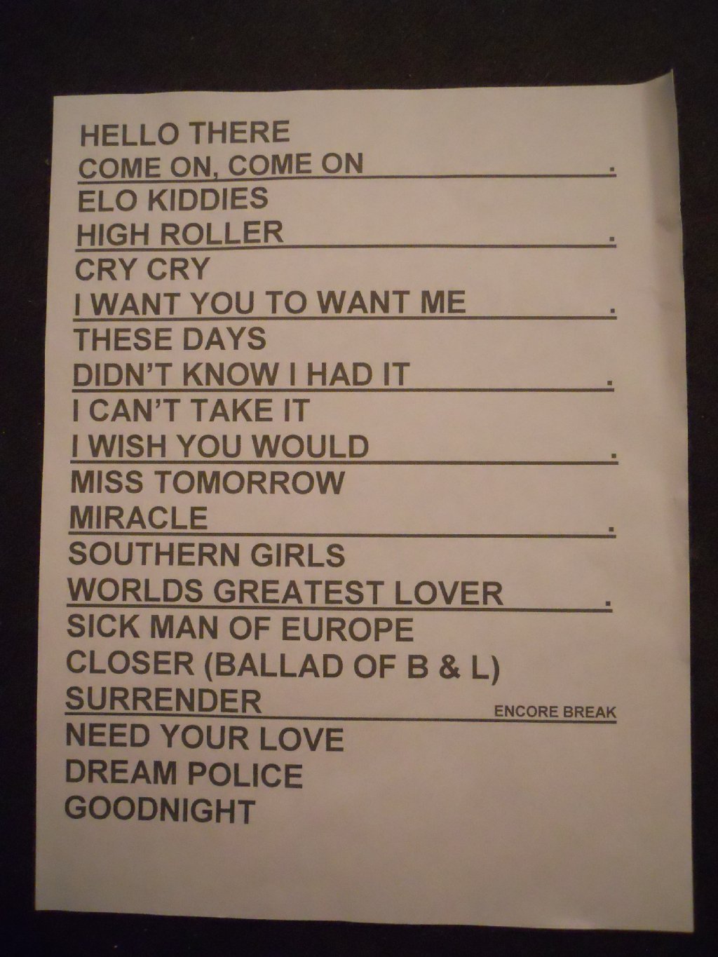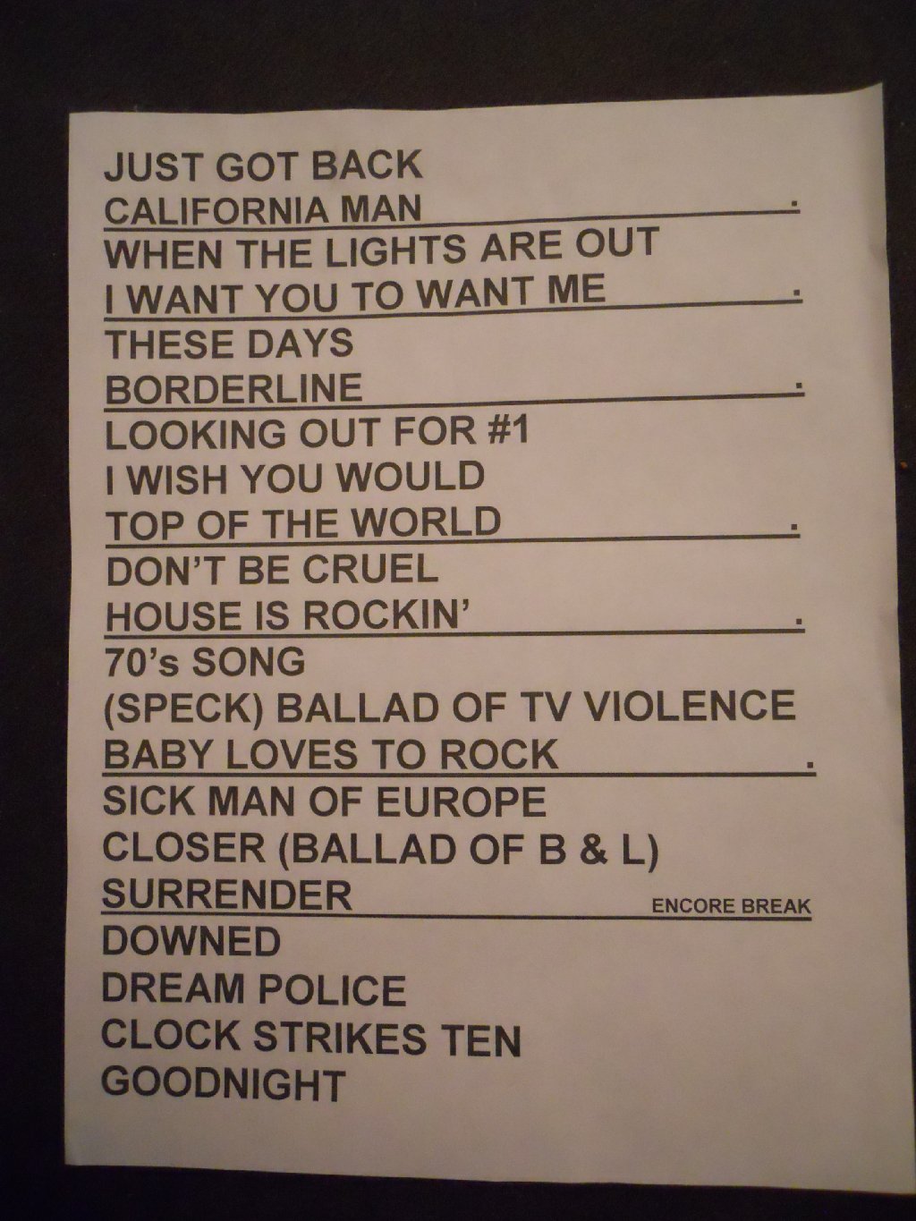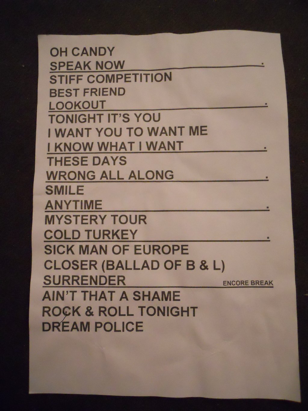 black suit, black shirt with multicoloured Beatles logos Oh Candy, Speak Now, Stiff Competition, Best Friend, Lookout, Tonight Its You, IWYTWM, I Know What I Want, These Days, Wrong All Along, Smile, Anytime, Magical Mystery Tour, Cold Turkey, Sick Man of Europe, Closer, Surrender // (encore) Ain’t That a Shame, Rock’n’Roll Tonight, Dream Police The set opened with three classic and high energy songs – “Oh Candy”, “Speak Now” (the first of many live rarities tonight) and “Stiff Competition” (which hasn’t been heard live in awhile). All received a cheer and big applause. After “Stiff Competition”, Rick took to the mic – “Yeah! Thank you very much, thanks for coming. This is the last night of the tour.” Then looking back at the band he asked “Ready Robin? Tom? Rest of you guys?” And with that they went into “Best Friend”, which has been out of the set for probably a year. A dark, brooding monster, that was really cool to hear again. The band then went into “Lookout”, which isn’t often heard live. After that Rick reminded the crowd (in case anyone REALLY didn’t know) – “Just in case you’re not sure, we are the opening and closing band… we are the band Cheap Trick, thank you!” They went into “Tonight Its You”, followed by the ever crowd-pleasing “I Want You to Want Me”. The band was sounding terrific, really tight and at the peak of their game. Rick was certainly healthier tonight than at any time during the tour. It’s hard to say that the band were any better than the opening night in Glasgow when they’d played a wonderful show. It just seemed that they’d improved slightly (if that is possible) with each show, and that this showpiece final tour show in London saw them at their best yet. After “IWYTWM”, Rick briefly introduced Magic and Daxx, then added “Right now a song we haven’t played in awhile, but we’ve got Tom Petersson…”. The band went into “I Know What I Want” with Tom on lead vocals, and Robin was now wearing the black police cap. Afterwards Rick reminded the crowd, “Tom Petersson, the inventor of the 12 string bass guitar”. He continued “Hello to a few friends – you’re ALL our friends… we have people from all over… Germany, Italy, Japan, Israel? Estonia? Spain? France. Believe it or not some people from the US…” He also pointed out a couple of “celebrity” friends up in the first balcony. He continued “We got an award the other night from Classic Rock magazine. Inside the new issue is a copy of The Latest for everyone”. The band continued with “These Days”, one of the only 6 songs that stayed in each set list through the tour. After that came the short but high tempo “Wrong All Along”, after which Rick again addressed the crowd “Cool! Our favourite lead singer in the whole wide world, Mr Robin Zander! Here we go, here’s another from The Latest”. The band went into “Smile”, another live rarity at CT shows though it had featured in the summers “Sgt Pepper Live” shows in Las Vegas. Very nice to hear. Afterwards Rick noted “We are Cheap Trick, we fear nothing!” That was followed up by another from the self-titled 1997 album, “Anytime”. Very cool to hear this one again after many years. Rick again briefly spoke “Hey! Earlier this year we were asked to do something special…” He paused and noted “…the volume in this place is too quiet…” Maybe they were hanging on his every word? Anyway, he cupped his hand to his ear and got a big cheer in return. The band went into another infrequent visitor to the setlist, “Magical Mystery Tour”. As always, the band does a wonderful job covering The Beatles. The song had a long ending, and after the loud applause afterwards, Rick noted “Oh, so you’ve heard that one…!” Next up was “Cold Turkey”, which hasn’t been played live in a lot of years. A glorious Lennon cover, which again the band nailed to perfection. That was followed by “Sick Man of Europe”, a wonderful “Closer: The Ballad of Burt & Linda” and the main set closer “Surrender”. The latter saw not one but two album flats thrown out – the first was a “signed “Dream Police” LP cover I believe, festooned with Rick picks; the second was a KISS album cover in keeping with the lines of the song and which had been bought in London just that morning! The band left the stage to rapturous applause and cheering, and Rick soon came back on to check if the audience wanted to hear more. Very loudly they confirmed “YES!!” Rick responded “Thank you from the bottom of our hearts”. The encore started with another classic, “Ain’t That a Shame”, followed by probably the most surprising song of the tour, at least for me. I’d been lucky enough to hear the first outing of “I Wish You Would” a couple of weeks ago in Michigan, so that hadn’t been a surprise to me earlier in this tour. But hearing “Rock’n’Roll Tonight” was a major, and very cool surprise. The closing song on 1990’s “Busted” album, I don’t know if it was ever even played live back in the early 90’s, certainly not more recently. I’ve never heard it live before. Anyway, the London crowd heard this “Move” cover for the very first time tonight, and from where I was standing, I could see the look of delighted shock on some of the diehard fans in the front row as they realised from the first few bars what this was! The set closed with “Dream Police” which saw a couple of funny, unusual moments. Just leading up to Rick’s piece in the middle, Robin picked up Rick’s mic stand to move it to mid stage… only for him to be holding the top half whilst the bottom half remained at stage left! Rick’s tech hurriedly ran on and got the thing right just before Rick started his spiel. And that in itself was unusual, I didn’t understand a word of what he said! Anyway, the show ended at 10:06pm with the band getting an overwhe
