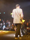 red/white/black striped jacket, black shirt with multicoloured Beatles logos,