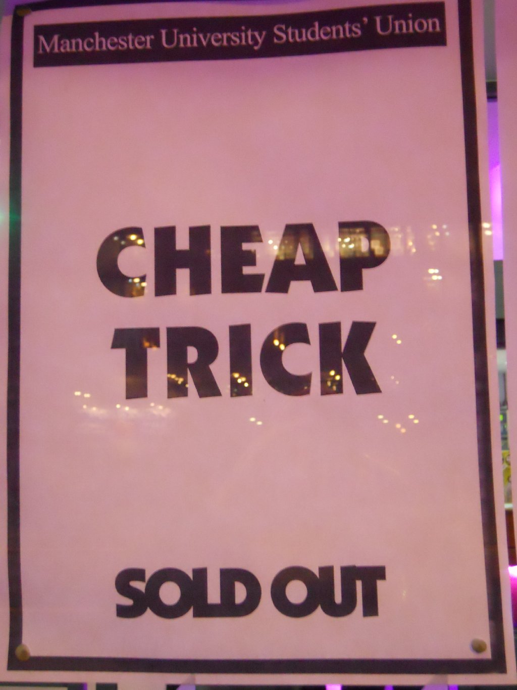 black suit, white shirt, black bow tie Dream Police, Sick Man of Europe, Closer, Surrender, IWYTWM, Goodnight Now The band opened with one of their trademark songs, “Dream Police”. Being so used to seeing a melee in the crowd at shows when Rick throws out the pick showers, it was weird here to see the picks thrown out and barely anyone bothered to even pick one up. For the second or third shower Rick even came down the steps from the stage and threw them right at Geddy Lee’s table! Someone did then start picking picks up off the floor and looking at them, and that encouraged others in the crowd to come look for picks AND stand up for the show. By the end of the song pretty much everyone was on their feet. “Sick Man of Europe” was next, followed by another new song, “Closer: The Ballad of Burt and Linda”. Cool to see swirly light patterns projected during this, very much in keeping with the mood of the song. There was a shorter ending to this song, as the band had obviously been given a time limit for their set. Next up was “Surrender”, and cool to see many in the crowd dancing along to this. No album flat was thrown out. After “Surrender”, Rick briefly addressed the crowd. “Thank you so much for having us. To commemorate our award from Classic Rock, and to be involved in the current issue… I think you’ll know this one, here we go”. The band went into “I Want You to Want Me”, which of course went down very well. They closed the set with “Goodnight Now”, and wowed the crowd with 3 endings. The suits obviously weren’t as used to multiple endings as we are! Rick quickly closed with “Thank you, goodnight!” and the set was over at 10:47pm. The band couldn’t have done better. They played a flawless 20 minute set, with a nice balance of two songs from “The Latest” as well as three classic hits and “Goodnight Now”. Rick showed no signs of being affected by his lingering cold, Robin sounded amazing as always, Tom’s bass filled the venue, and as ever the 3 original members were ably supported by Daxx and Magic. They cannot have failed to impress the industry suits. We headed back to our hotel, just managing to get a late MacDonalds takeout before it closed at midnight! More photo work before bed! Thursday 11 Nov – Cheap Trick in Manchester After the brief “lull” for the award show, it was back to normal business, with the next two shows of the tour. Thursday morning was dull, damp and breezy in London. We caught a train just after 9am, getting to Leeds at 11:25am. Two hundred miles north of London it was very windy, as well as grey and rainy. We got the bus from Leeds centre to my house, and left again at 2pm. This time it was just a “short” drive, 50 miles over to Manchester. The drive was tough going at times, with strong winds cutting across the highest stretch of motorway in England. We parked near Manchester University at 3:20pm. The venue was on the first floor of the Students Union building, the “Academy 2”. The venue was another rectangular room, smaller than Wolverhampton, with a maximum capacity of no more than 1,000. The lower part of the walls was red, with the upper part dark, with dark curtains. The stage was, uhh… cosy… the smallest on the tour. There was hardly any sidestage room for the techs, and the stage monitor board had to be located in a small side room off to the side of the main floor. That would make the show very challenging for the stage monitors-tech. In fact, the stage was so small that barely 50% of the normal backline could be fitted on. Most stayed on the truck outside. The technical crew certainly had their work cut out to make everything happen in this tight venue and kudos to them for ensuring the show went ahead. With the crowd just outside and waiting to get in, the band sound checked with “Big Eyes”, “Fan Club”, “Hot Love” and “The Flame”. Things were pretty rushed after that, but the audio montage started up at 9:24pm, with the band coming on at 9:27pm to an enormous roar of approval from the crowd. Before I get into the performance, I must say that the show was sold out, and that was evident when I tried to get in at the back and literally could not get more than a leg into the room. It was packed solid, like sardines in a can. I ended up going to near the monitor soundboard off to the side of the stage, with barely a sightline because of the speaker stack on Tom’s side! However, I did creep in front of the security barrier a few times during the show to get some shots for the official website! One great thing about the small venue and packed crowd was that it really condensed the atmosphere. The crowd was fantastically enthusiastic and their energy really hit the band, which in turn helped the band pour out their energy back. Wonderful atmosphere. RN –